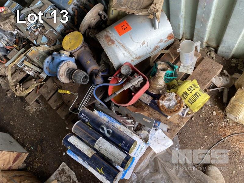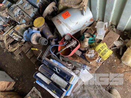 PALLET LOT, ARC WELDING RODS, MIG WIRE (NEW IN BOX), ASSORTED VALVES, PRESSURE TESTER, McNAUGHT GREASE PUMP WITH HOSE & HAND PIECE, SUIT 20kg PAIL, NEW!