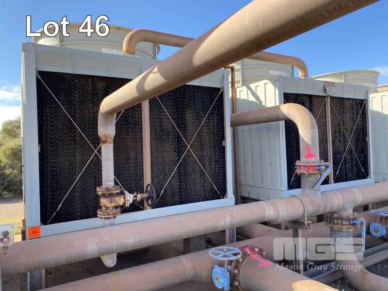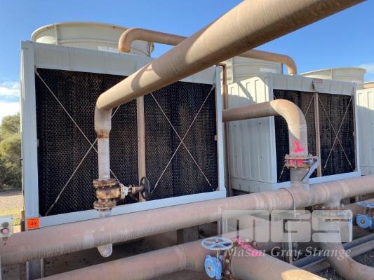 PAIR POWER THERMAL COOLING TOWERS ON GALV STANDS, 2.2m DIAMETER FAN, 2.6 x 2.4 x 3.4m (H), WITH LINK PIPES, 415v (NO PUMP) NOTE: DISCONNECTION AT FIRST VALVE)