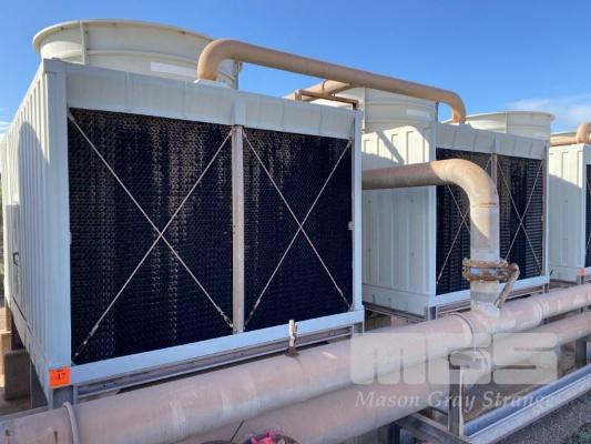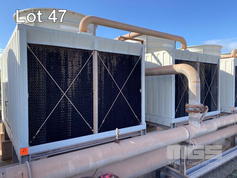 PAIR POWER THERMAL COOLING TOWERS ON GALV STANDS, 2.2m DIAMETER FAN, 2.6 x 2.4 x 3.4m (H), WITH LINK PIPES, 415v (NO PUMP) NOTE: DISCONNECTION AT FIRST VALVE)