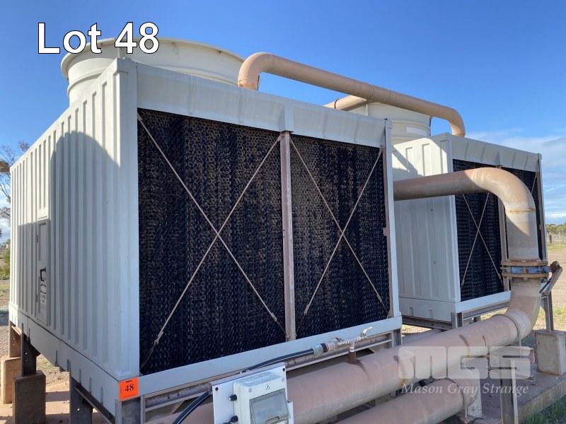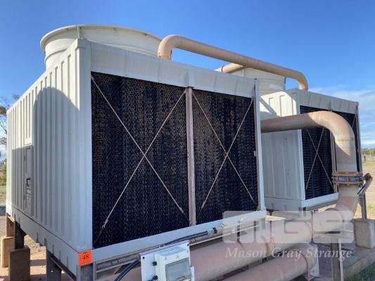 PAIR POWER THERMAL COOLING TOWERS ON GALV STANDS, 2.2m DIAMETER FAN, 2.6 x 2.4 x 3.4m (H), WITH LINK PIPES, 415v (NO PUMP) NOTE: DISCONNECTION AT FIRST VALVE)