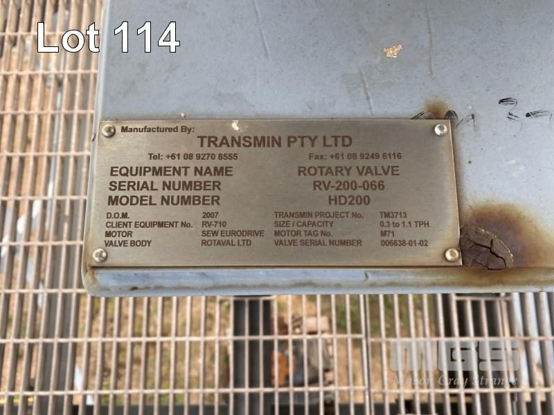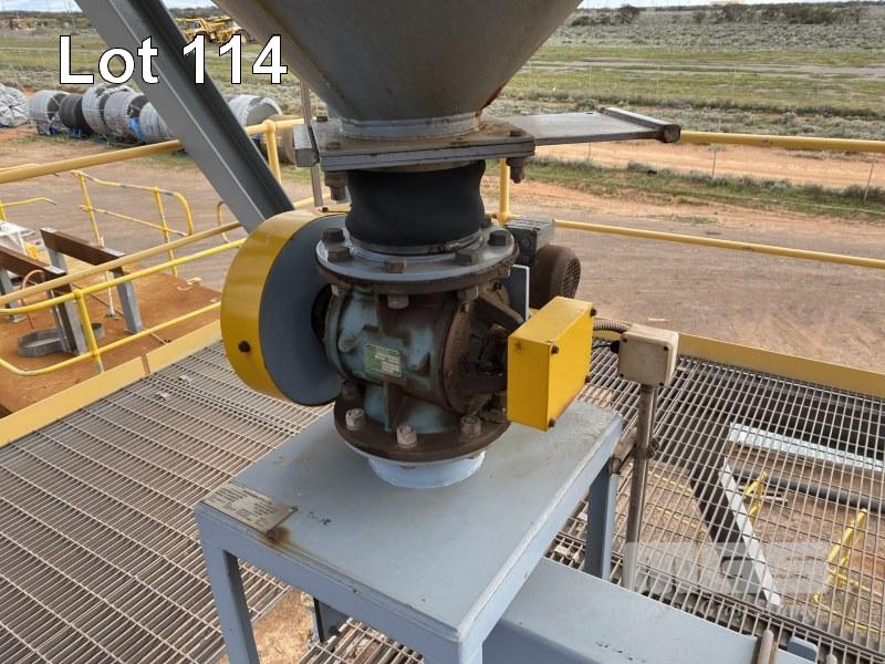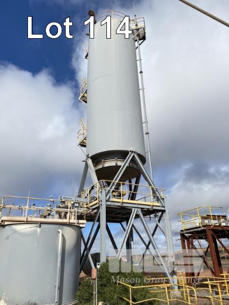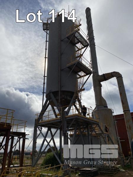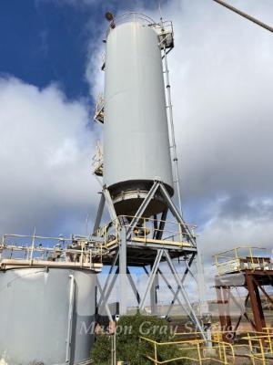 TRANSMIN SILO ON STAND, 160m3, WITH VIBRATING CONE, ROTARY VALVE, SERIAL: RV-200-066, MODEL: HD200 INCLUDES ACCESS STAIRCASE & PLATFORM, SEPARATES AT LOWER RUBBER COUPLER