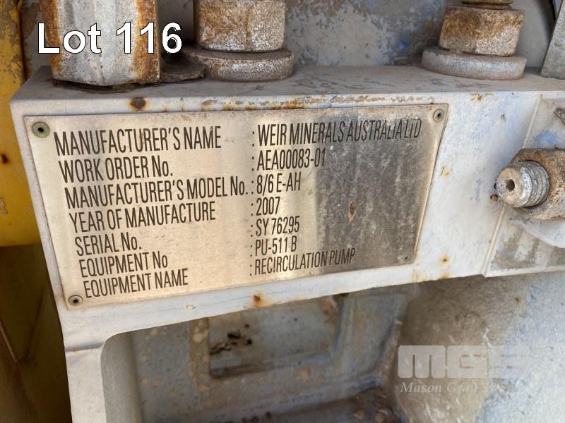 WARMAN PUMP, 8/6 FRAME: E, TYPE: AH, SERIAL: SY76295, SUPPLIED BY WIER METALS AUSTRALIA, 110kw, 415v, 1482rpm