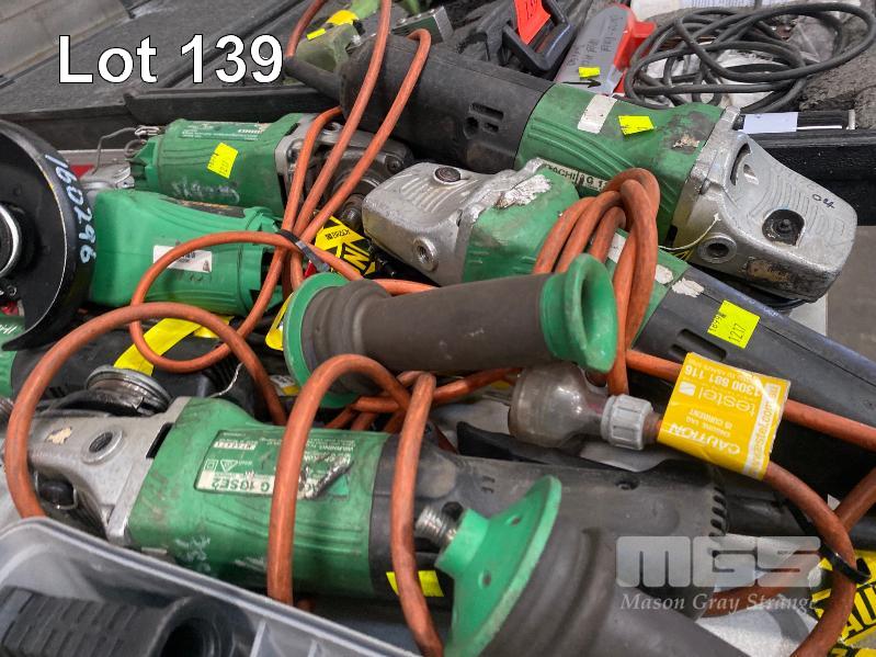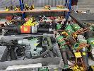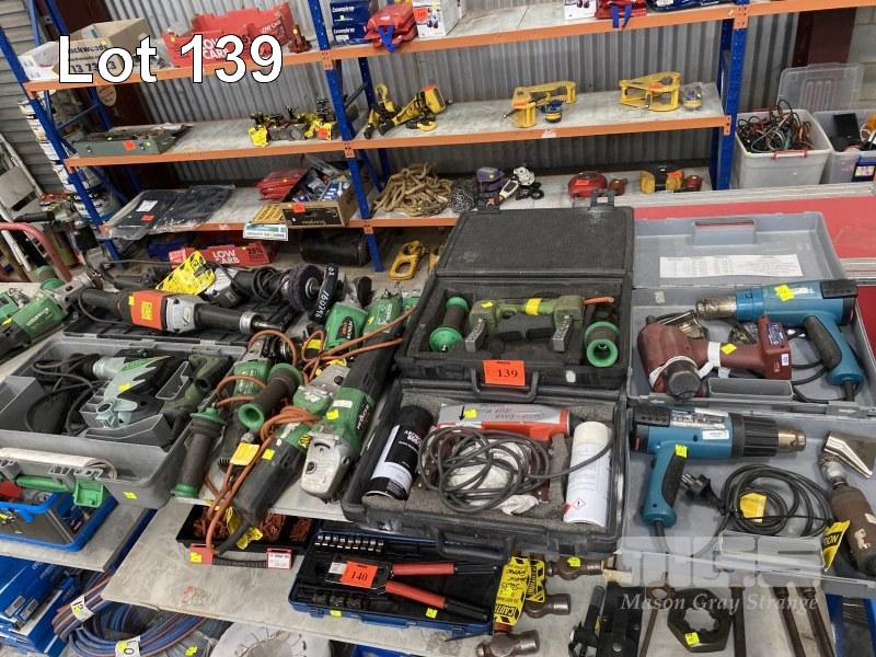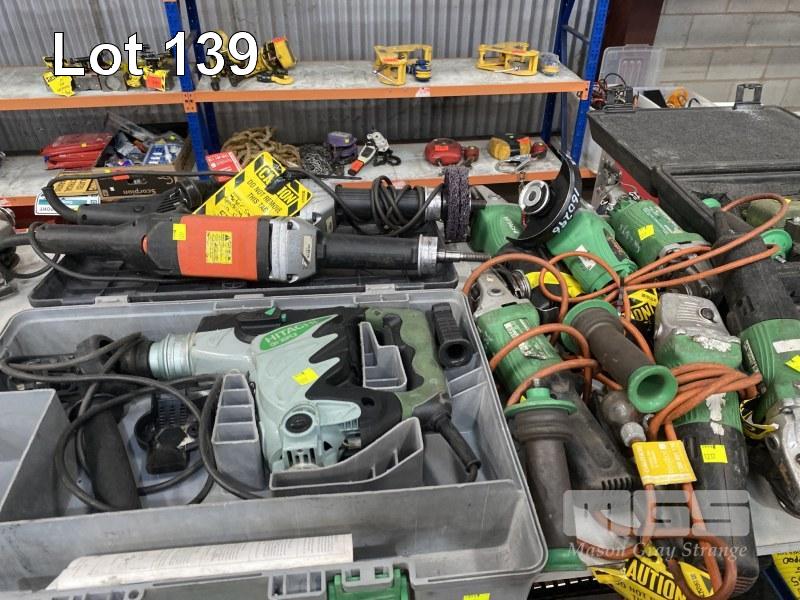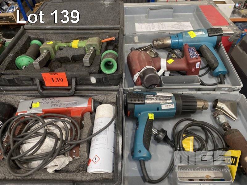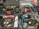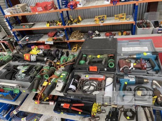 ASSORTED FAULTY POWER TOOLS (SOME MINOR, SOME MAJOR FAULTS), MAKITA HEAT GUNS, MAGNETIC TEST UNITS, HITACHI GRINDERS & HAMMER DRILL ETC