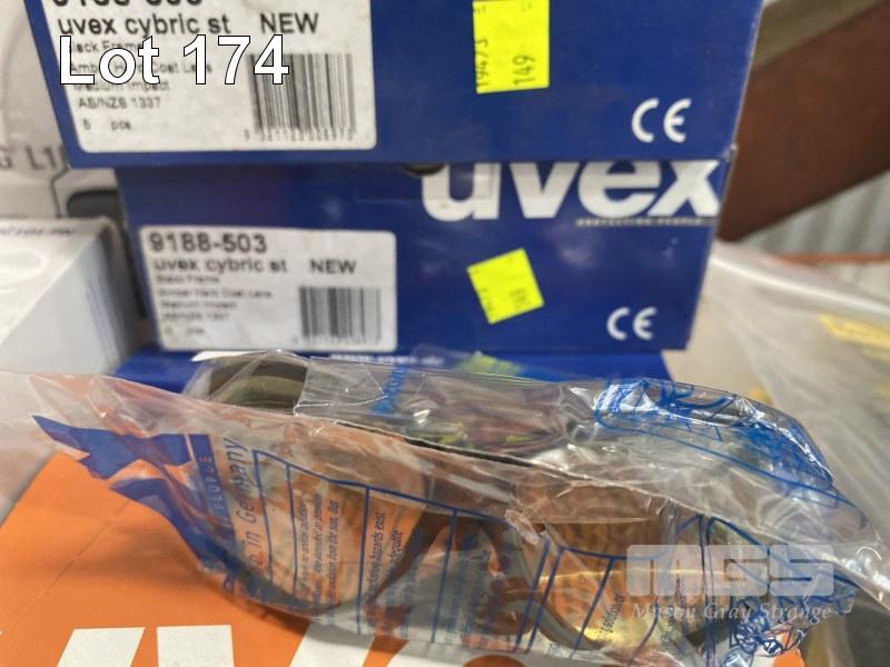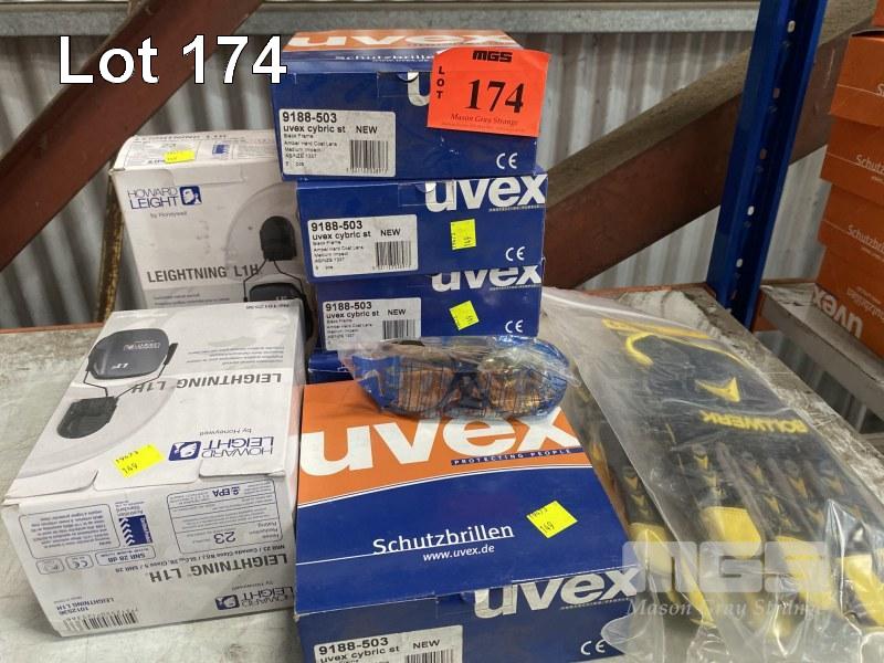 6 x BOXES (5/BOX) UVEX SAFETY GLASSES, CYBRIC ST 9188-503, AMBER & 2 x PAIRS GLOVES & HARD HAT EAR MUFFS