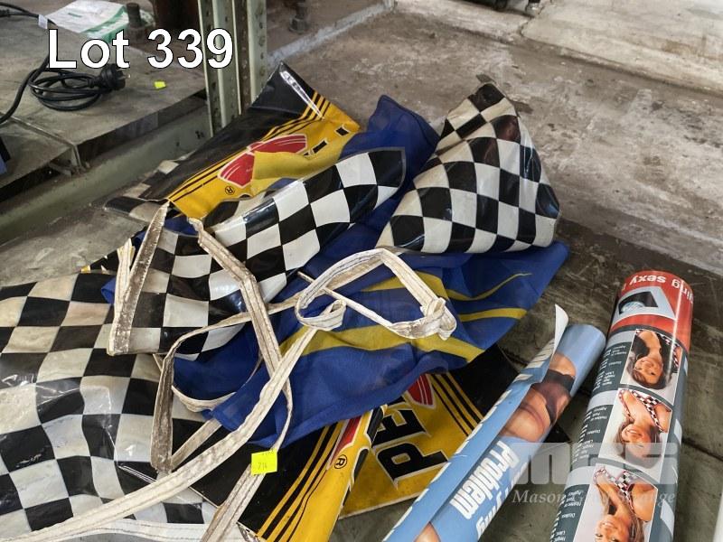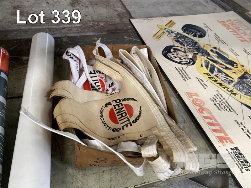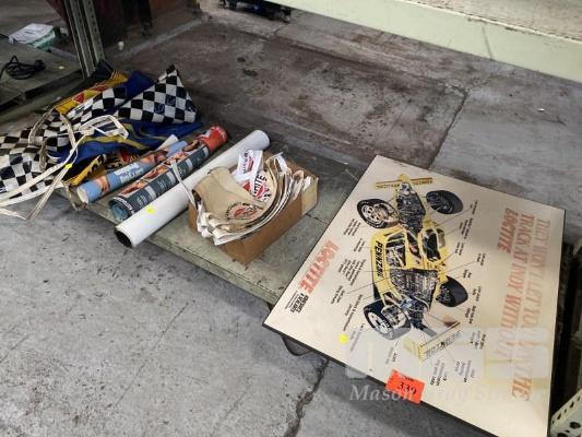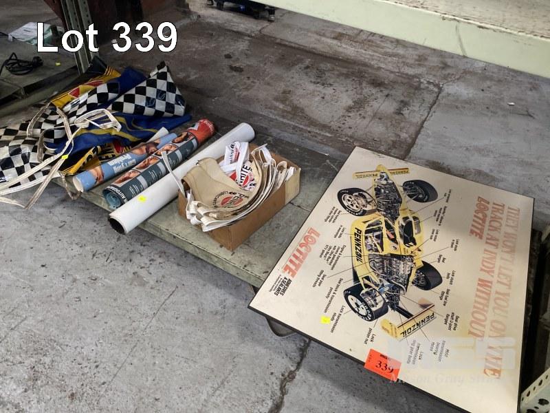 RACING PARAPHERNALIA, FLAGS, GRID GIRL POSTERS, PENZOIL, LOCTITE, PENRITE