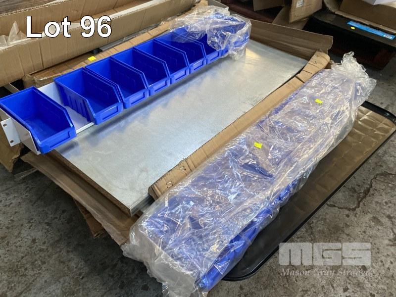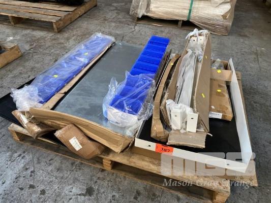 TRADIES SHELVING FIT OUT TO SUIT VAN INCLUDING 2 x STEEL SHELF TRAYS, 950 x 430mm 2 x STEEL TOPPED SHELVES, 950 x 430mm, 2 x PARTS DRAWER SHELVES, 950 x 170mm WITH PARTS DRAWERS, BRACING SUPPORTS & 2 x OIL DRIP TRAYS, 1 x PALLET
