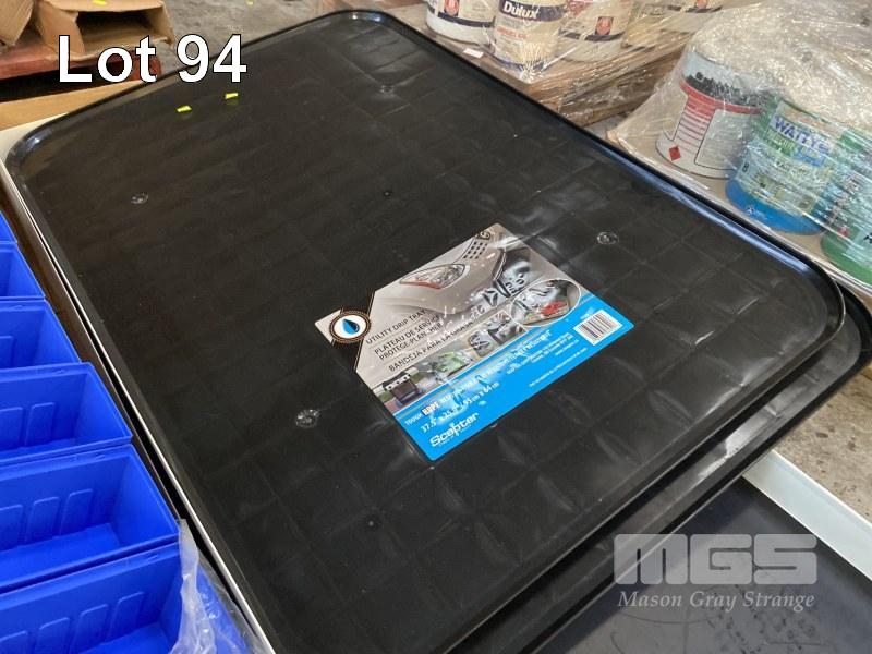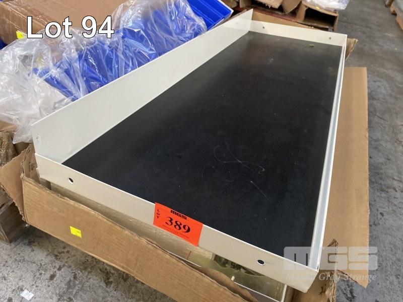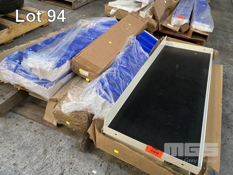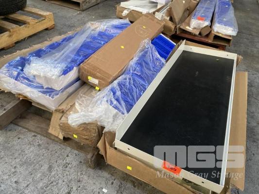 TRADIES SHELVING FIT OUT TO SUIT VAN INCLUDING 2 x STEEL SHELF TRAYS, 1250 x 430mm 1 x STEEL SHELF TRAY, 950 x 430mm, 2 x PARTS DRAWER SHELVES, 1000 x 150mm, WITH PARTS DRAWERS & 2 x OIL DRIP TRAYS, 1 x PALLET