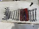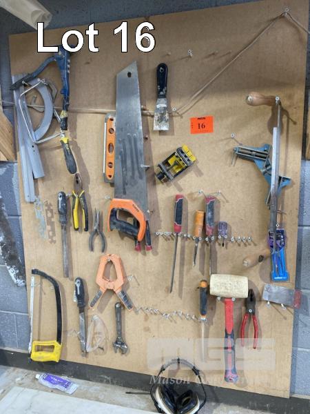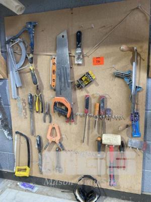 SHADOW BOARD OF TOOLS, SAWS, HAMMERS, SOCKETS, RING & OPEN END SPANNERS,RATCHET SPANNERS PLIERS & MORE