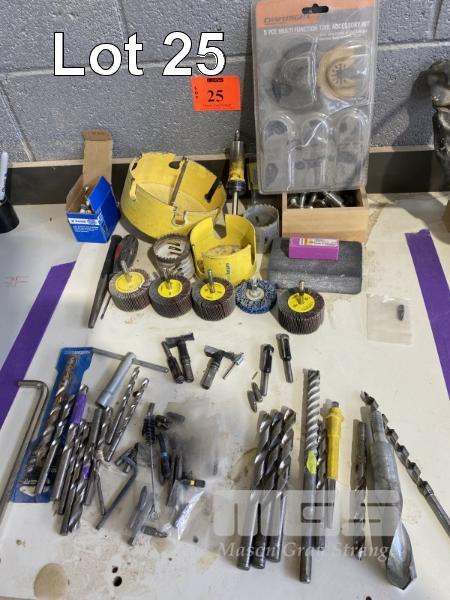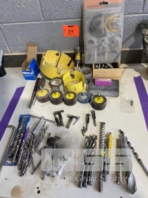 ASSORTED DRILL BITS, HOLE SAWS, LINISH ATTACHMENTS & DRIVE BITS