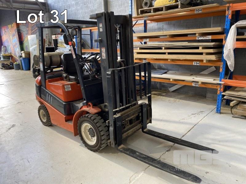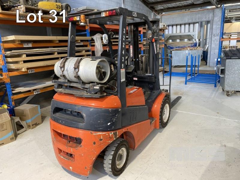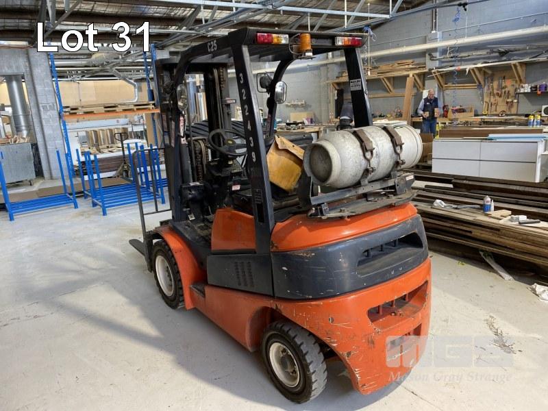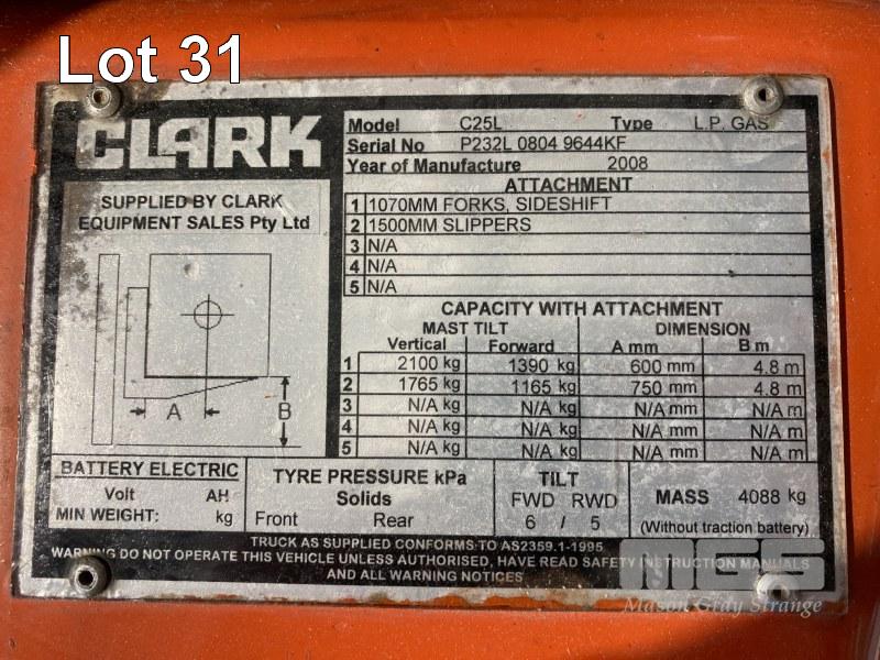 FORKLIFT, CLARK MOD: C25L DOM: 2008 S/NO: P232L-0804-9644KF 2,100kg LIFT SIDE SHIFT SEE THRU CONTAINER MAST, 4800mm (H) CUSHIONED SOLID TYRE LPG 2,539 hours
