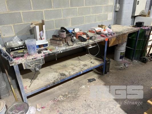 WORK BENCH, STEEL FRAME, SOLID TIMBER TOP, 3m x 760mm CARPENTER VICE & DRAWER
