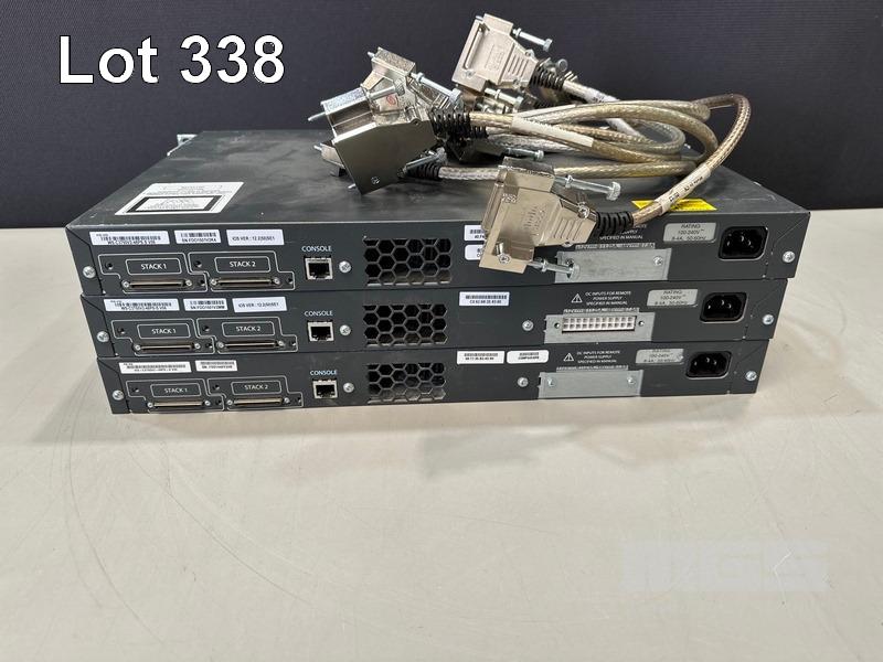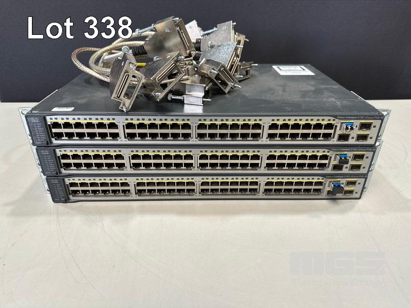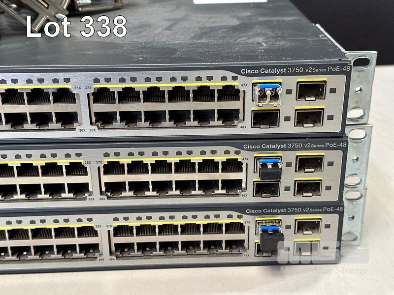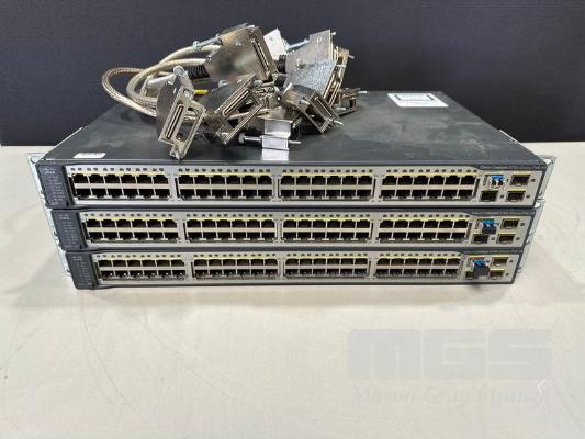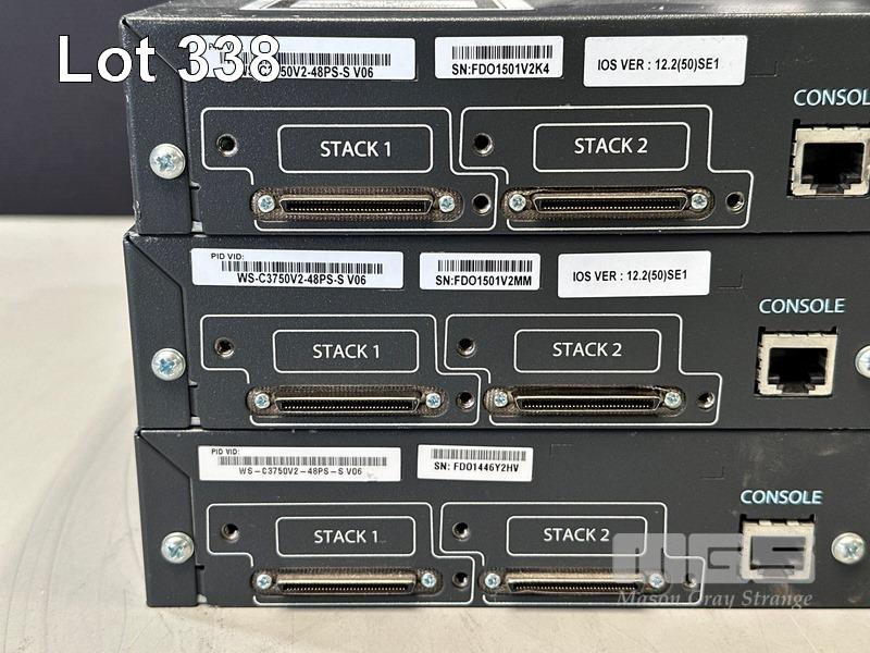 3 x CISCO CATALYST 3750 V2 SERIES PoE-48 PORT SWITCHES, WS-C3750V2-48PS-S WITH STACKING CABLES S/N:FDO1501V2K4, FDO1501V2MM, FDO1446Y2HV