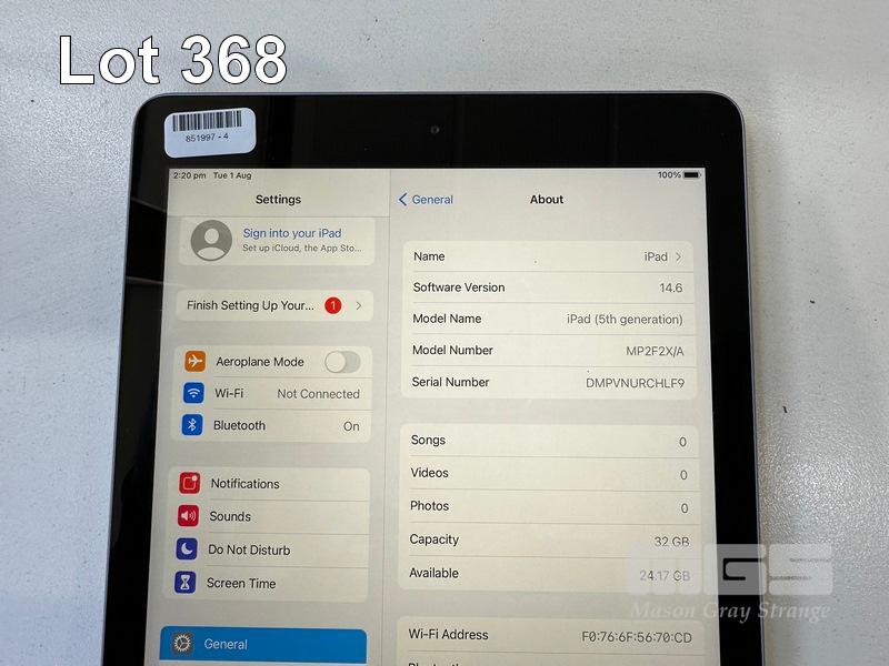 APPLE iPAD (5TH GEN), 32GB, Wi-Fi, SPACE GREY, MODEL A1822, MP2F2X/A (NO CABLE, NO CHARGER) S/N:DMPVNURCHLF9