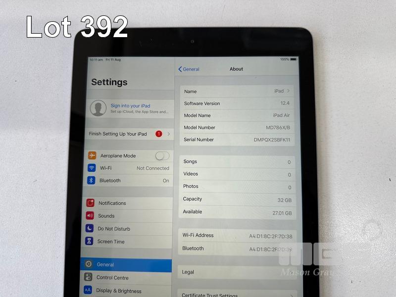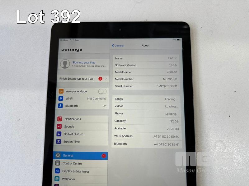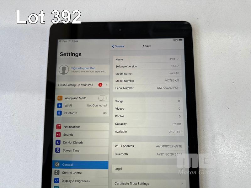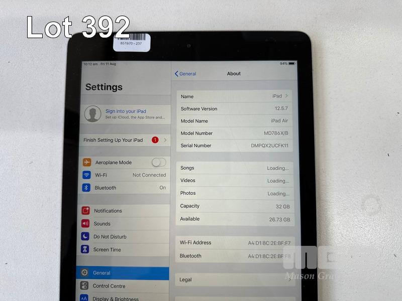 6 x APPLE iPAD AIR, 32GB, Wi-Fi, SPACE GREY, MODEL A1474, MD786X/B (NO CABLES, NO CHARGERS) (NOTE: ALL VARIOUS CRACK LINES ON SCREEN) S/N:DMPQX2UCFK11, DMPQX2SBFK11, DMPQWH7TFK11, DMPQWAC1FK11, DMPQX313FK11, DMPQX1FEFK11