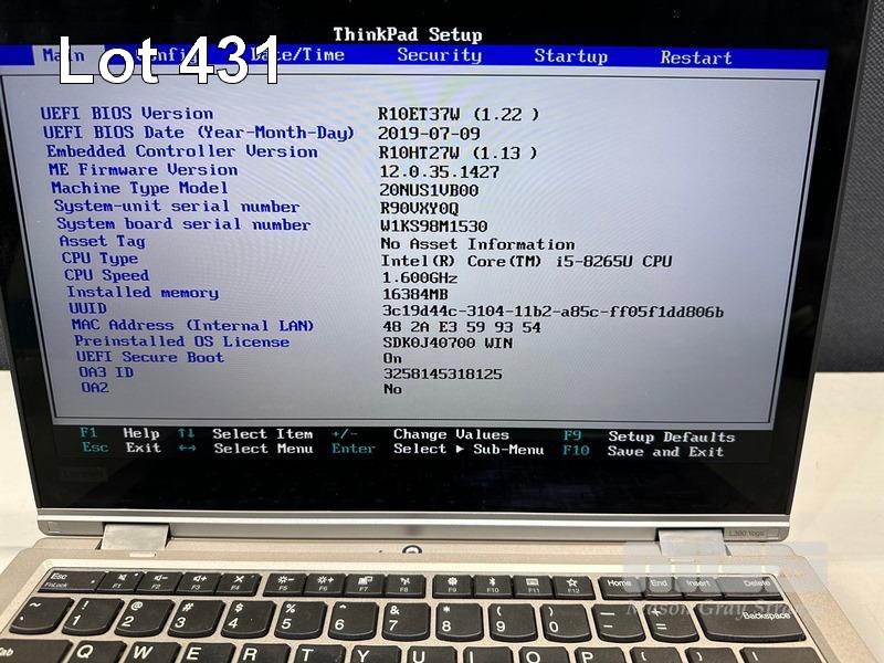 LAPTOP, LENOVO THINKPAD L390 YOGA, TYPE 20NU, CORE i5 8265U (8TH GEN) @ 1.6GHz, 16GB DDR4 RAM, 256GB NVMe M.2 SSD, 13.3" TOUCHSCREEN (1920x1080), INTEL UHD GRAPHICS, Wi-Fi, BLUETOOTH, WINDOWS 11 HOME INSTALLED (NO USB-C POWER SUPPLY) (NOTE: MINOR MARKS ON SCREEN) S/N:R90VXY0Q