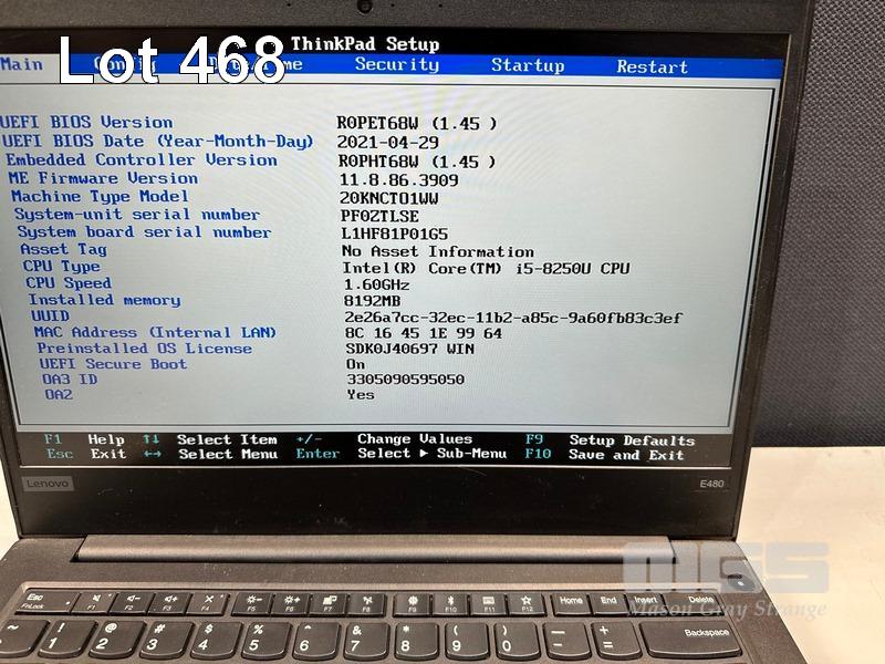 LAPTOP, LENOVO THINKPAD E480, TYPE 20KN, CORE i5 8250U (8TH GEN) @ 1.6GHz, 8GB DDR4 RAM, 256GB NVMe M.2 SSD, 14" WIDESCREEN (1920x1080), INTEL HD VIDEO, Wi-Fi, BLUETOOTH, WINDOWS 10 PRO INSTALLED & USB-C POWER SUPPLY (NOTE: SCRATCHES ON CASING, MINOR MARKS ON SCREEN) S/N:PF0ZTLSE