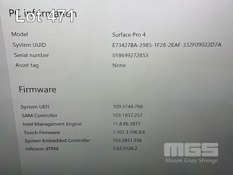 TABLET PC, MICROSOFT SURFACE PRO 4, MODEL 1724, CORE i5 6300U (6TH GEN) @ 2.4GHz, 8GB RAM, 256GB SSD, 12.3" TOUCHSCREEN (2736x1824), INTEL HD GRAPHICS 520, Wi-Fi, BLUETOOTH, WINDOWS 10 PRO INSTALLED, KEYBOARD TYPE COVER, STM DUX SHELL CASE & POWER SUPPLY S/N:018699272853