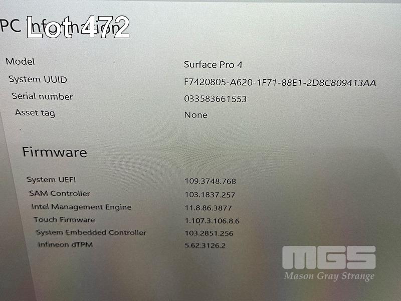 TABLET PC, MICROSOFT SURFACE PRO 4, MODEL 1724, CORE i5 6300U (6TH GEN) @ 2.4GHz, 8GB RAM, 256GB SSD, 12.3" TOUCHSCREEN (2736x1824), INTEL HD GRAPHICS 520, Wi-Fi, BLUETOOTH, WINDOWS 10 PRO INSTALLED, KEYBOARD TYPE COVER, STM DUX SHELL CASE & POWER SUPPLY S/N:033583661553