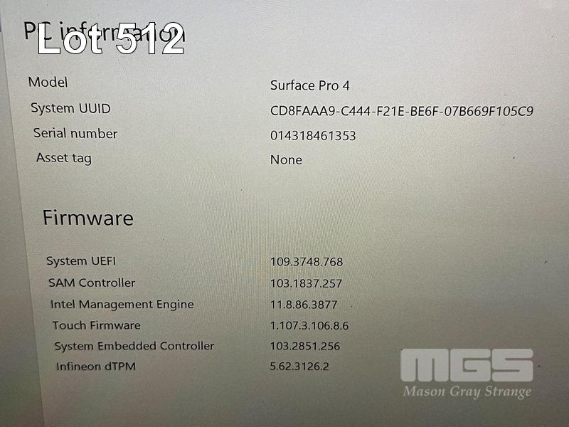 TABLET PC, MICROSOFT SURFACE PRO 4, MODEL 1724, CORE i5 6300U (6TH GEN) @ 2.4GHz, 8GB RAM, 256GB SSD, 12.3" TOUCHSCREEN (2736x1824), INTEL HD GRAPHICS 520, Wi-Fi, BLUETOOTH, WINDOWS 10 PRO INSTALLED, KEYBOARD TYPE COVER (NO POWER SUPPLY) S/N:014318461353