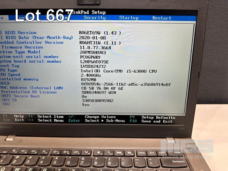 LAPTOP, LENOVO THINKPAD T460, TYPE 20FM, CORE i5 6300U (6TH GEN) @ 2.4GHz, 8GB DDR3 RAM, 525GB SSD, 14" WIDESCREEN (1920x1080), INTEL HD VIDEO, Wi-Fi, BLUETOOTH, WINDOWS 10 PRO INSTALLED & POWER SUPPLY (NOTE: MARKS ON SCREEN, BATTERY LATCH DAMAGED) S/N:PC0GPWKY