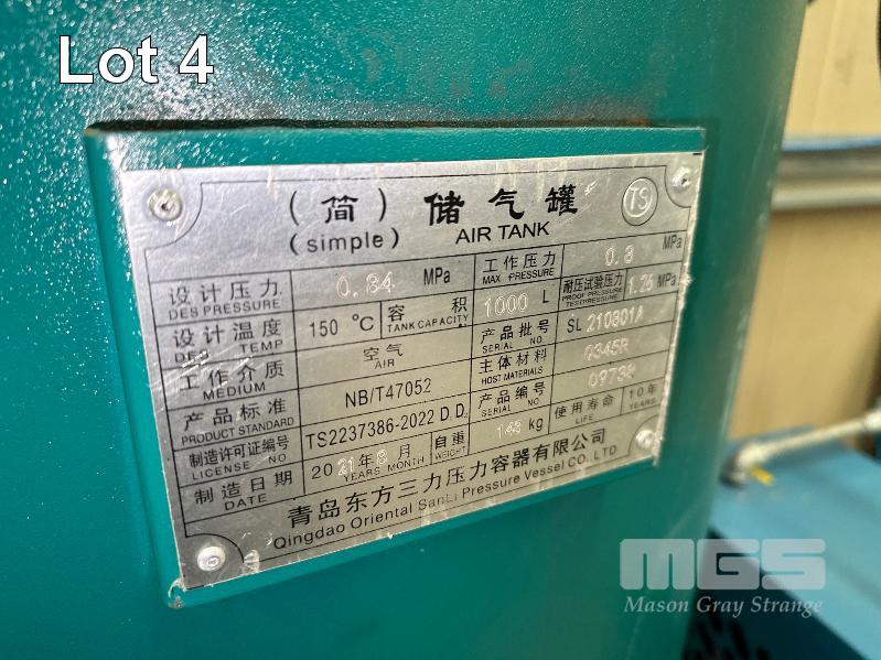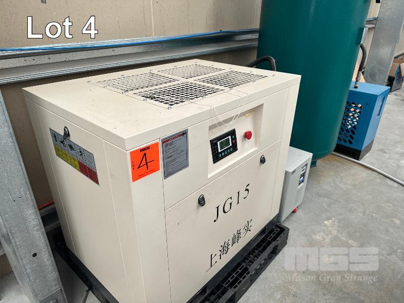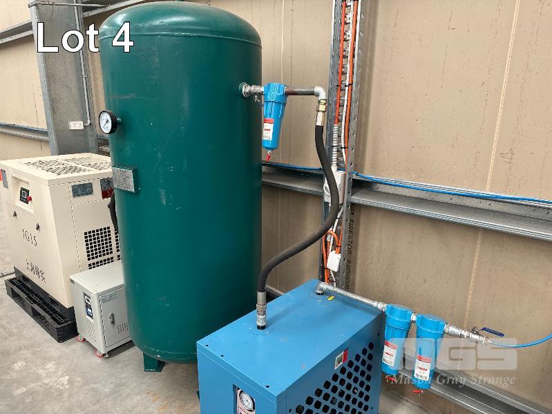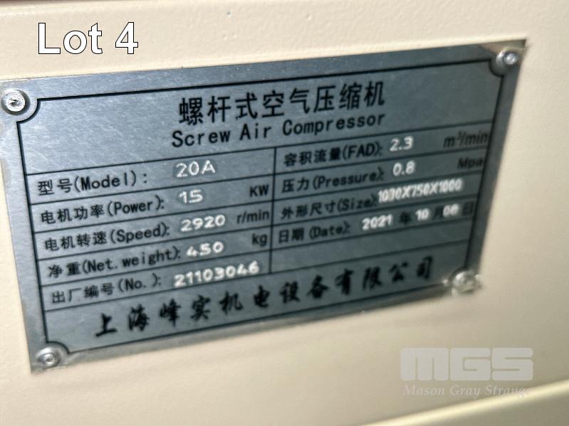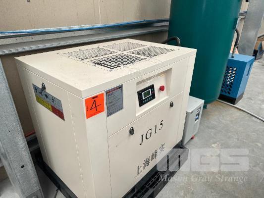 PACKAGED AIR COMPRESSOR SET TO INCLUDE: SCREW AIR COMPRESSOR MOD: 20A 15kw, 415V FAD: 2.3m3/MIN PRESSURE: 0.8MPA DOM: 21021 WITH VERTICAL AIR TANK, 1,000 LITRE & AIR DRYER - REFRIGERATED & DUAL FILTERS (NO TRANSFORMER)