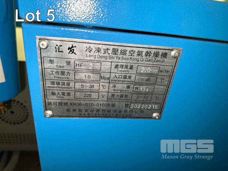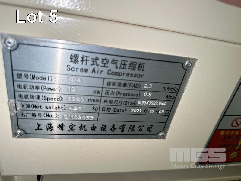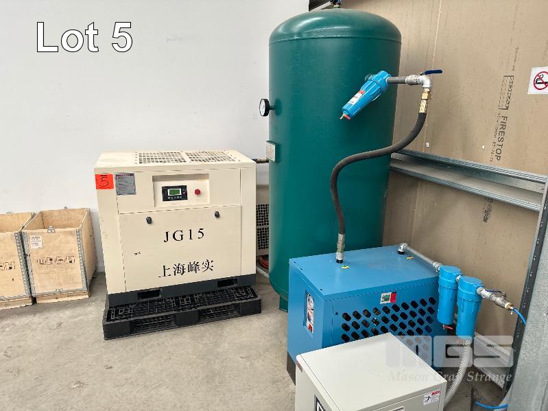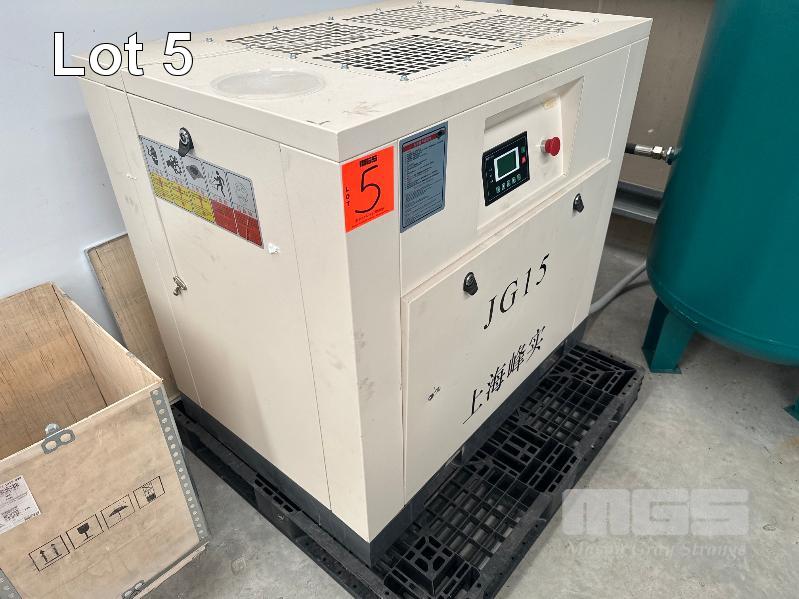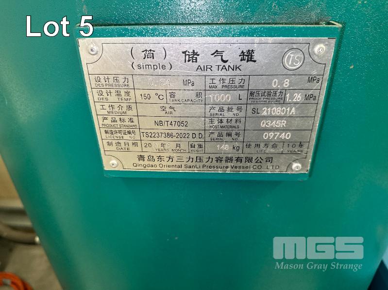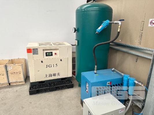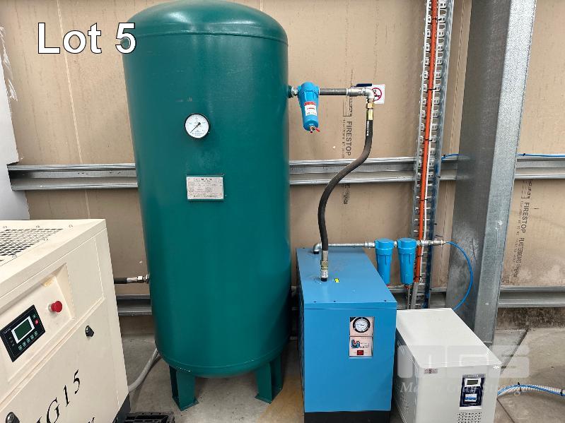 PACKAGED AIR COMPRESSOR SET TO INCLUDE: SCREW AIR COMPRESSOR MOD: 20A 15kw, 415V FAD: 2.3m3/MIN PRESSURE: 0.8MPA DOM: 21021 WITH VERTICAL AIR TANK, 1,000 LITRE & AIR DRYER - REFRIGERATED & DUAL FILTERS (NO TRANSFORMER)