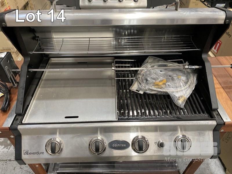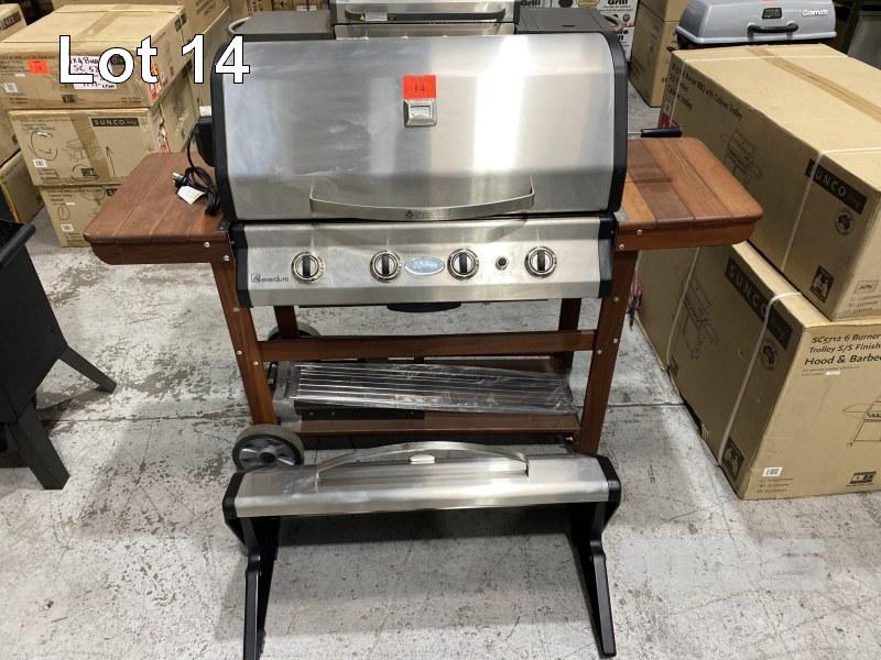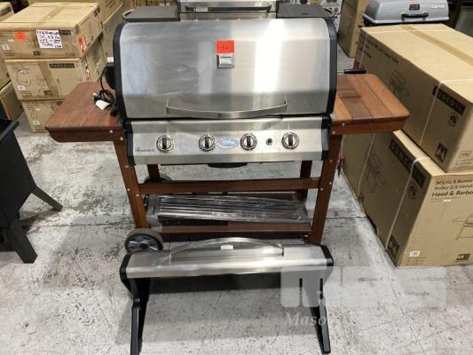 EVERDURE DRAIN TREE STAINLESS STEEL 4 BURNER BBQ, TIMBER FRAME, NATURAL GAS WITH BROMIC NATURAL GAS CONVERSION KIT, STAINLESS STEEL PLATE, 240v ROTISSERIE, ORP: $1,699
