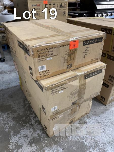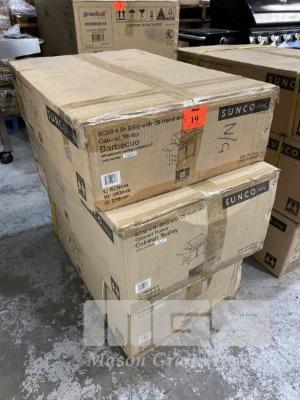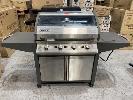 SUNCO 4 BURNER BBQ WITH CABINET TROLLEY, CONVERTED TO NATURAL GAS, STAINLESS STEEL WINDOW HOOD