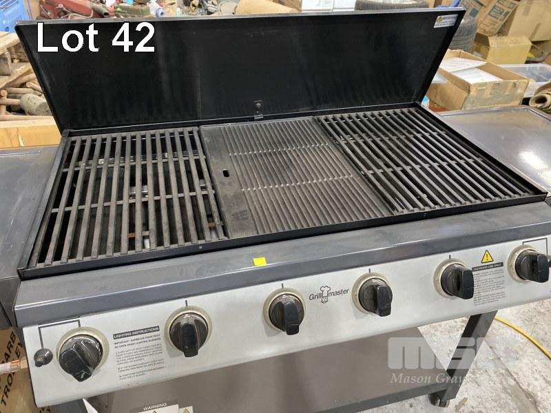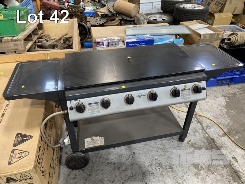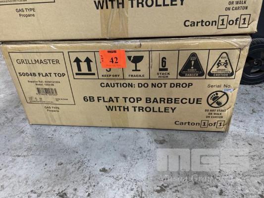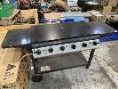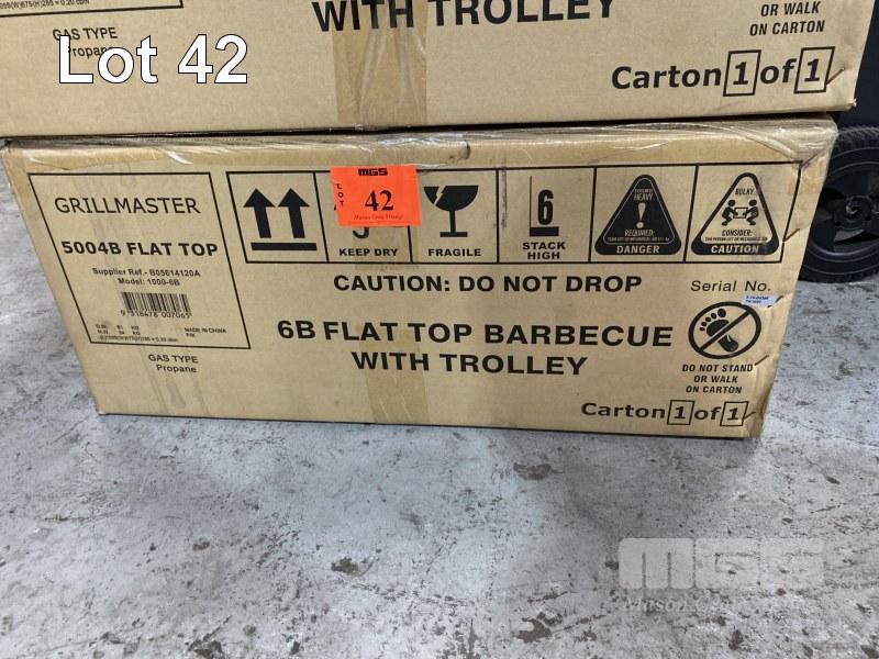 GRILLMASTER 6 BURNER FLAT TOP BBQ, ON MOBILE TROLLEY