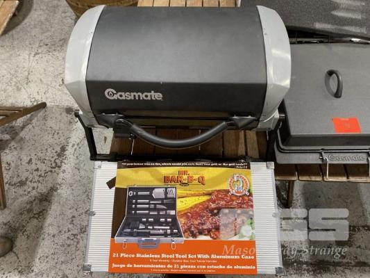 GASMATE CRUISER PORTABLE BBQ, MODEL: G2017, LPG & 'MR BBQ' 21 PIECE STAINLESS STEEL TOOL SET IN CARRY CASE