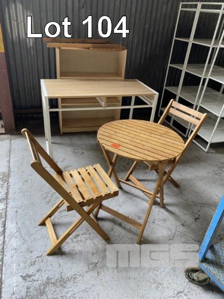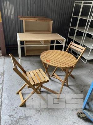 4 PIECE TIMBER OUTDOOR SETTING, TABLE & SHELF UNIT