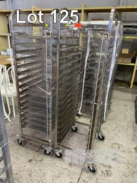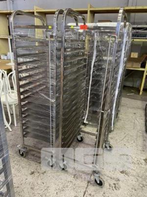 2 x STAINLESS STEEL BAKERS TROLLEYS, 15 & 16 TRAY WITH DRYING RACKS & TRAYS