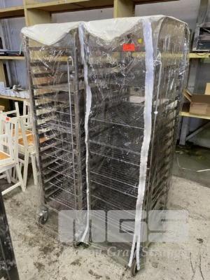 2 x STAINLESS STEEL BAKERS TROLLEYS, 15 & 16 TRAY WITH PVC COVERS