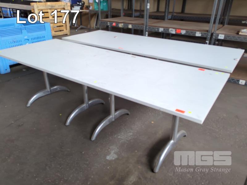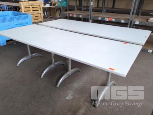 2 X RECTANGULAR MEETING TABLES. 240 X 90 CM. WHITE LAMINATE TOPS STEEL FRAME & LEGS.