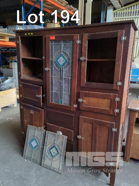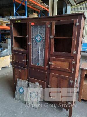 VINTAGE DECO KITCHEN DRESSER WITH STAINED GLASS DOOR PANELS.