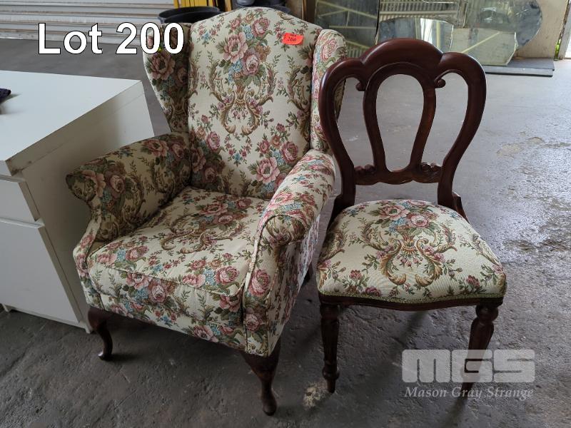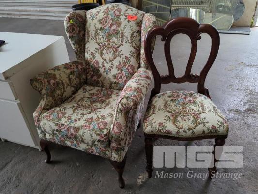 VINTAGE FLORAL FABRIC ARMCHAIR AND MATCHING FABRIC CUSHION SEAT DINING CHAIR