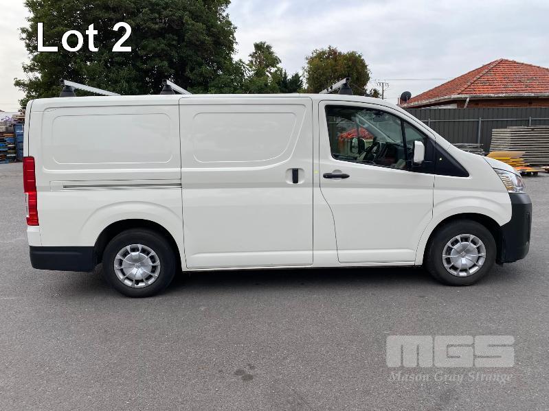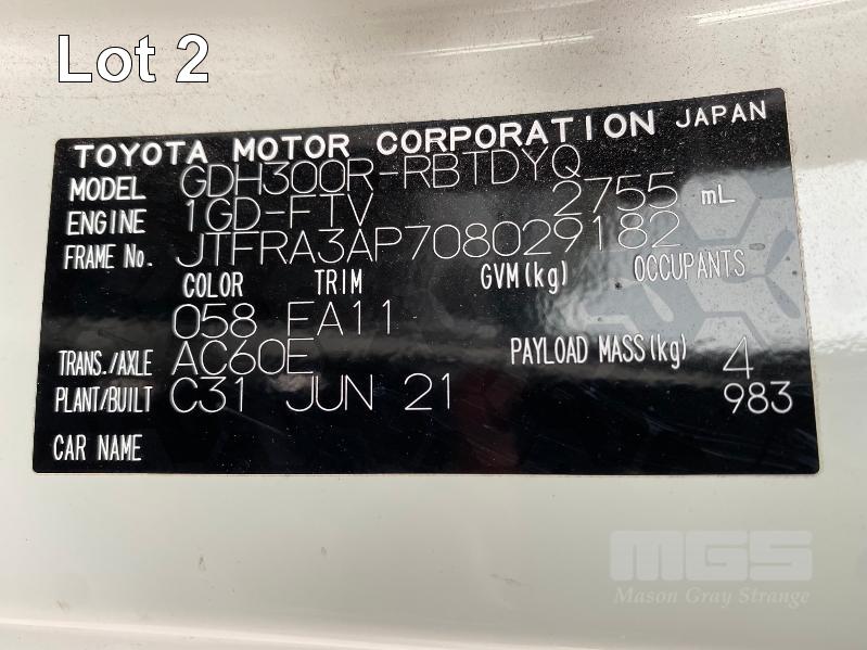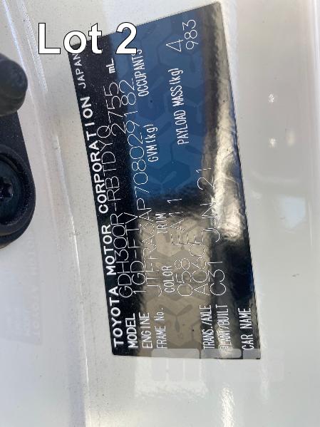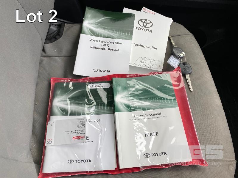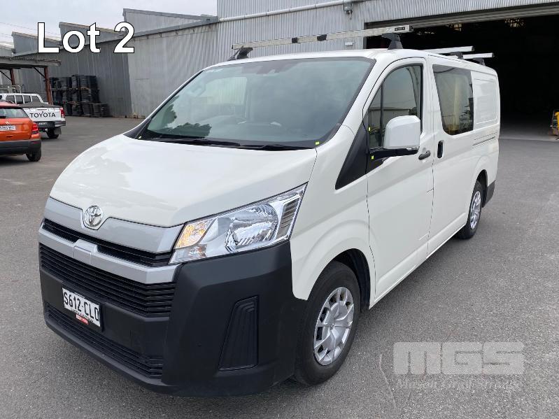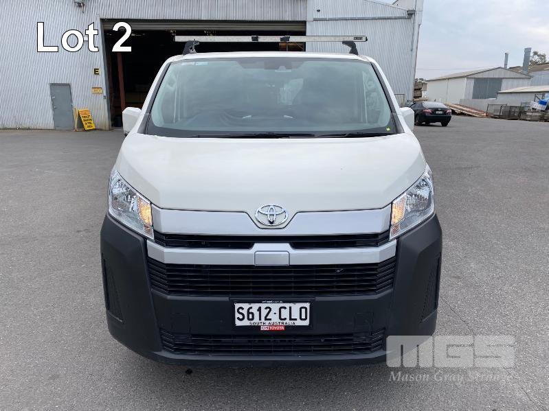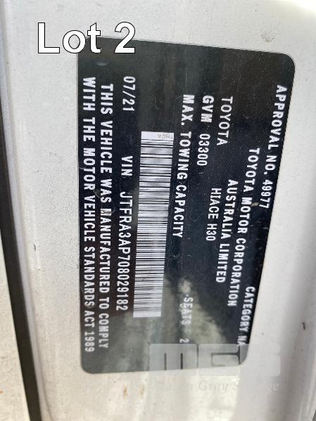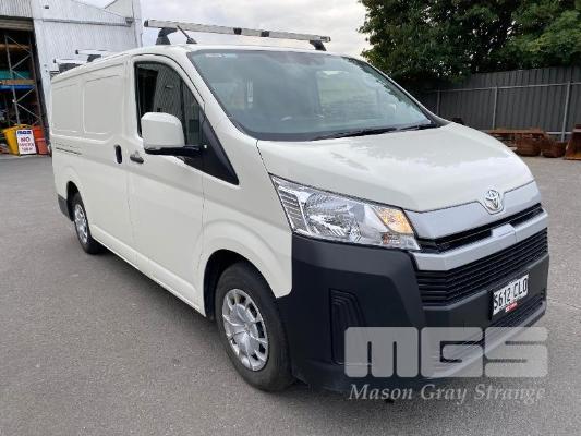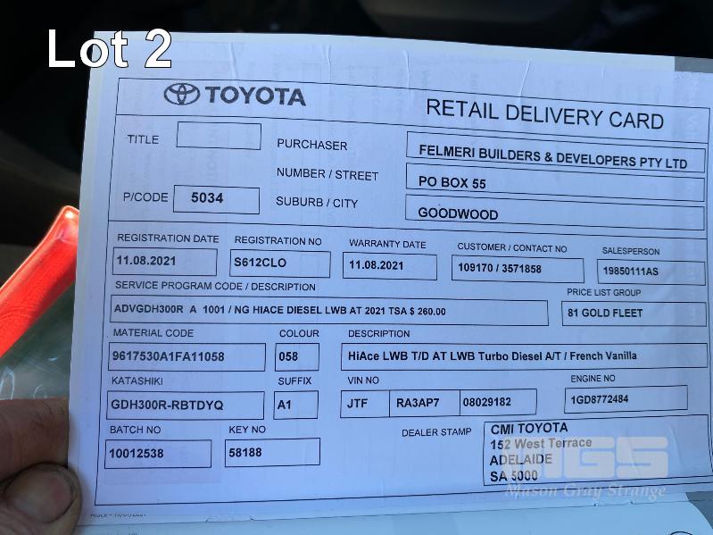 2021 TOYOTA HIACE GDH300R LWB VAN REG: S612 CLO (SA) VIN: JTFRA3AP708029182 ENG: 1G08772484 ODO: 30,679 kms INDICATED 2.8 LTR TURBO DIESEL, AUTO, WHITE DUCO, 2 DOORS, 2 SEAT, AIR BAG, AIR CON, BLUETOOTH, CARGO BARRIER, CENTRAL LOCKING, CRUISE CONTROL, DECALS, IMMOBILISER, POWER STEERING, POWER WINDOWS, ROOF RACKS, SPARE WHEEL, TOW BAR, REAR SHELVING FITTED KEY #13 (WITH 1 KEY/S, WITH OWNER'S MANUAL, WITH SERVICE BOOKS)