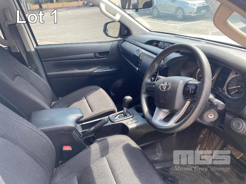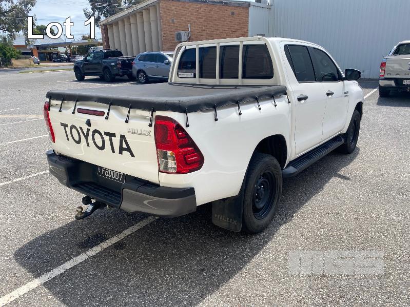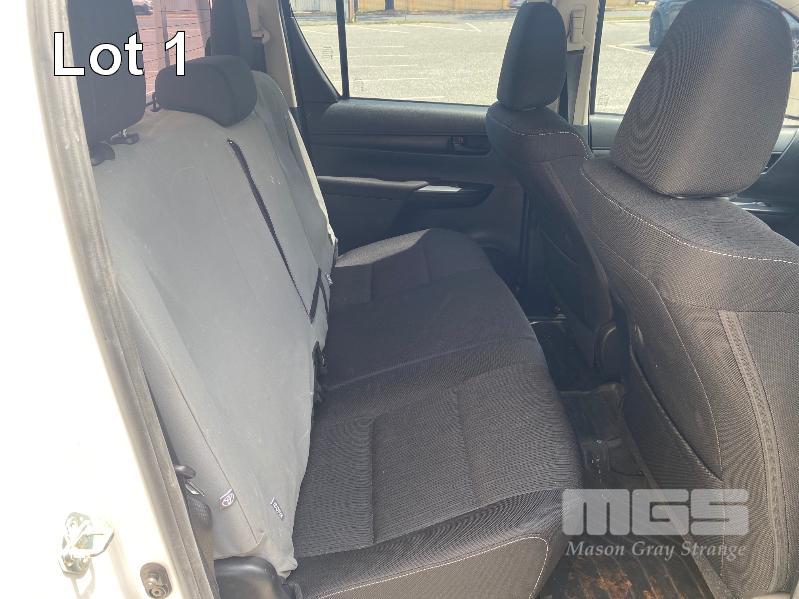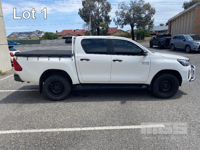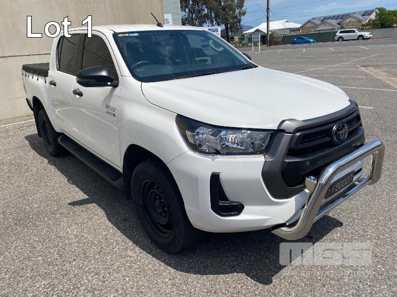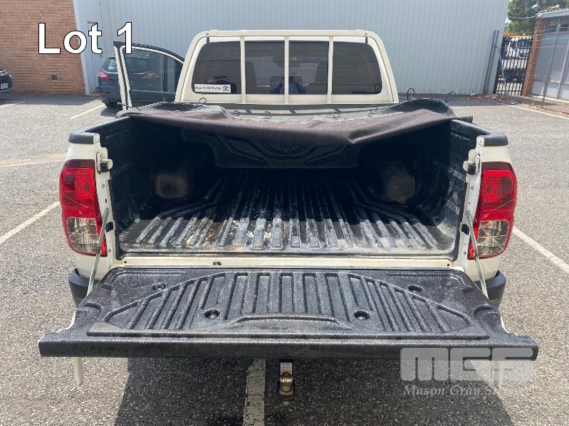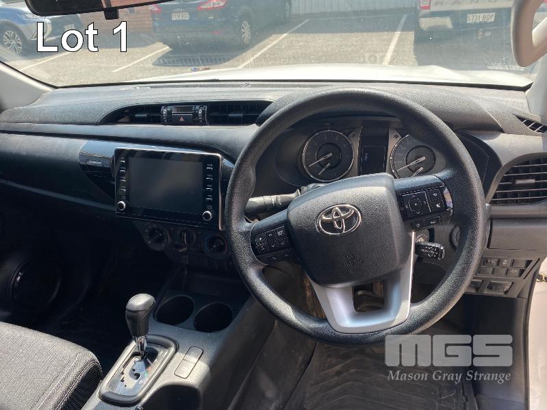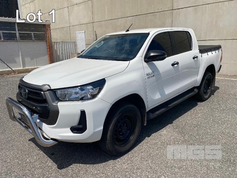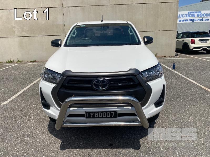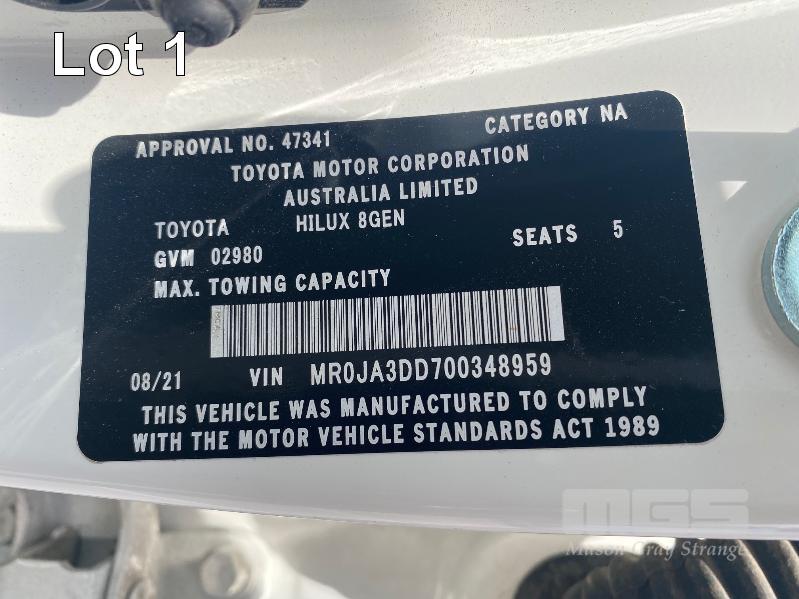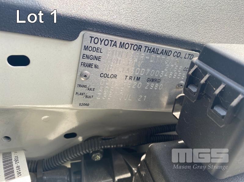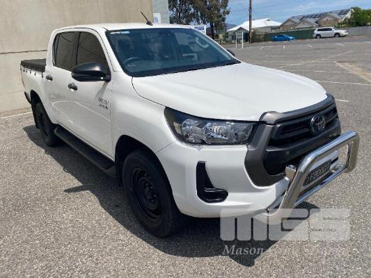 2021 TOYOTA HILUX GUN136R DUAL CAB UTILITY REG: FBD 007 (SA) VIN: MR0JA3DD700348959 ENG: 1GD5058118 ODO: 56,313 kms INDICATED 2.8 LTR TURBO DIESEL, AUTO, WHITE DUCO, 4 DOORS, 5 SEAT, ABS, AIR BAG, AIR CON, BLUETOOTH, CD PLAYER, CENTRAL LOCKING, CRUISE CONTROL, IMMOBILISER, NUDGE BAR, POWER STEERING, SIDE STEP, SPARE WHEEL, TOW BAR, WITH CANVAS SEAT COVERS KEY #58 (WITH 2 KEY/S, NO OWNER'S MANUAL, NO SERVICE BOOKS)