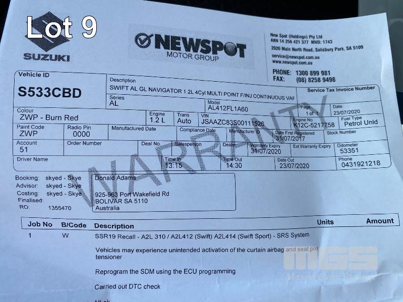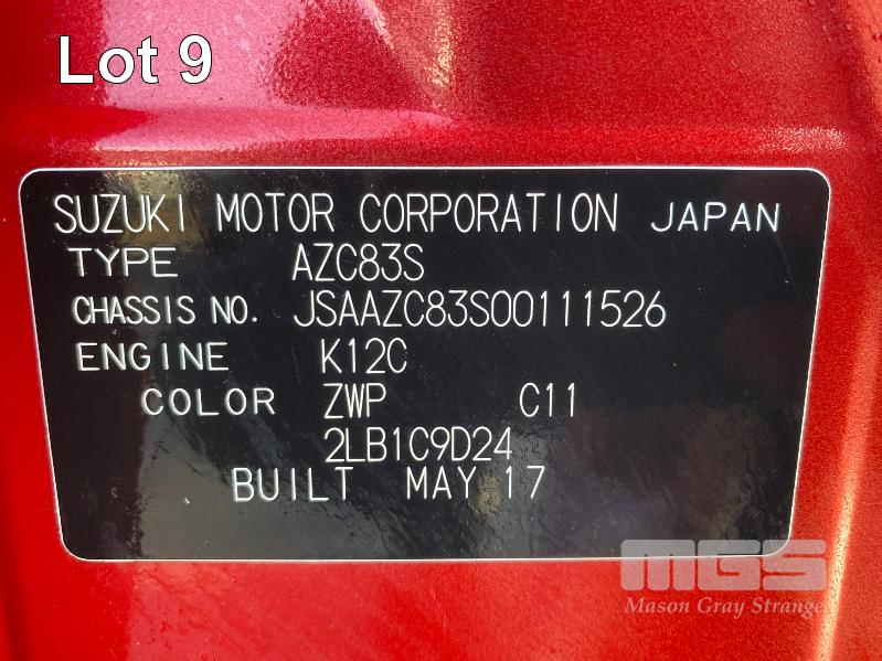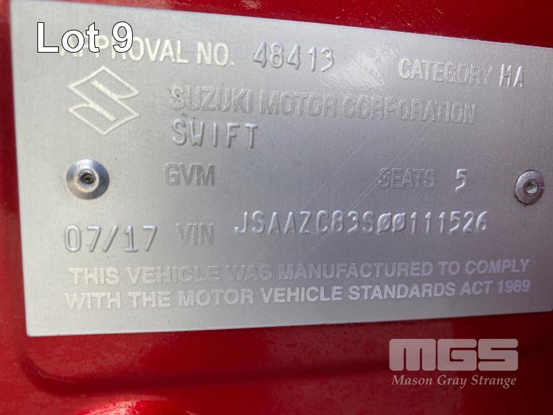 2017 SUZUKI SWIFT AL HATCH REG: S533 CBD (SA) VIN: JSAAZC83S00111526 ENG: K12C5217758 ODO: 66,0859kms SHOWING 1.2 LITRE PETROL, AUTOMATIC TRANSMISSION, RED DUCO, 3 DOORS, 5 SEAT, AIR BAG, AIR CON, ALLOY WHEELS, BLUETOOTH, CENTRAL LOCKING, CRUISE CONTROL, IMMOBILISER, POWER WINDOWS, SPARE WHEEL, TRACTION CONTROL, REVERSE CAMERA & LCD KEY #36 (WITH PAPERS, WITH 2 KEY/S, WITH OWNER'S MANUAL, WITH SERVICE BOOKS) CONDITION: ROOF - HAIL DAMAGE