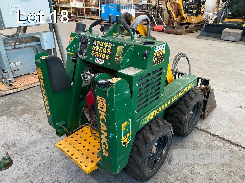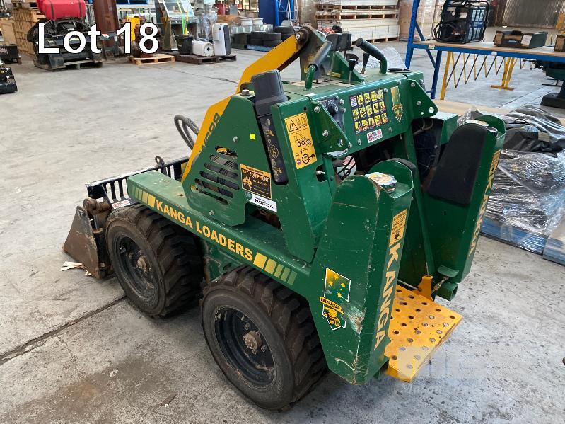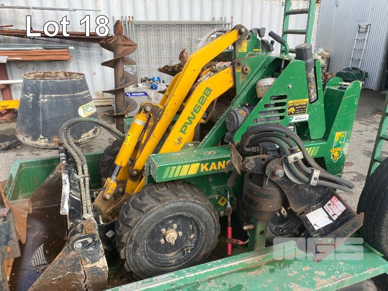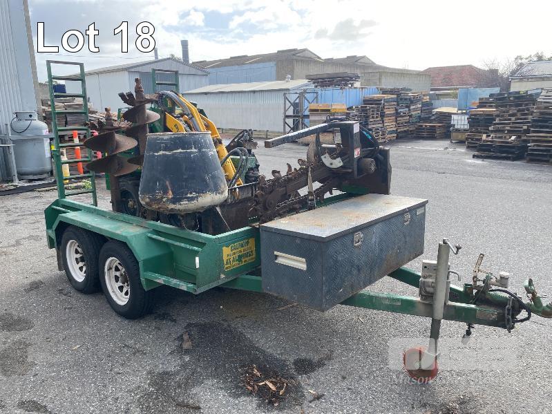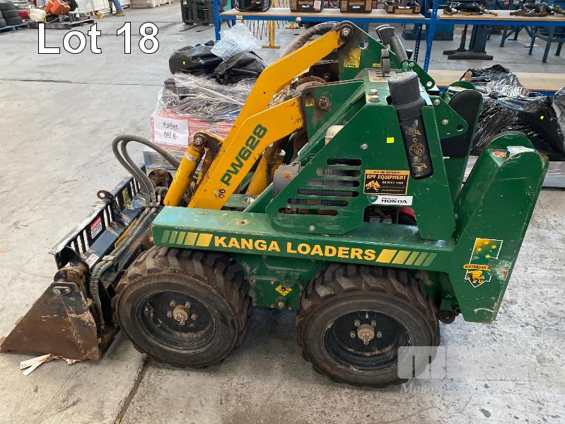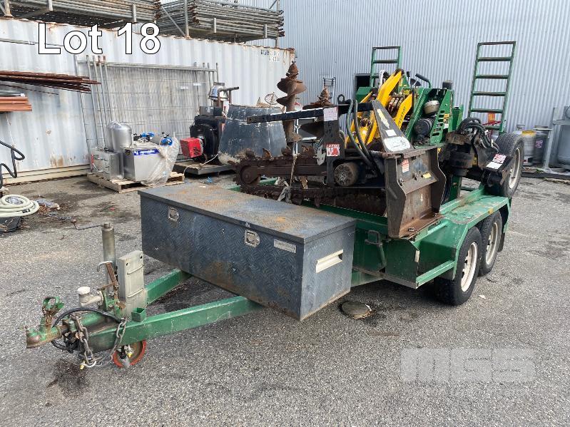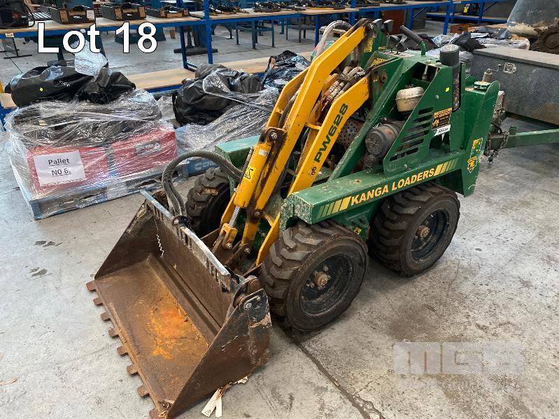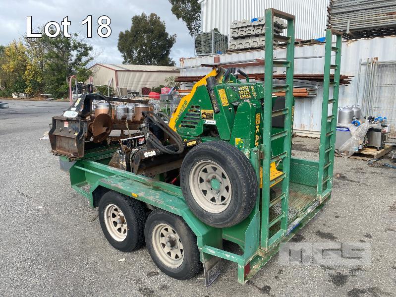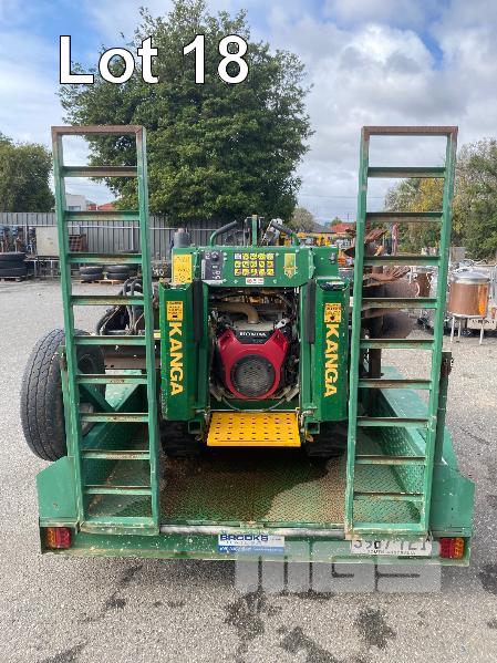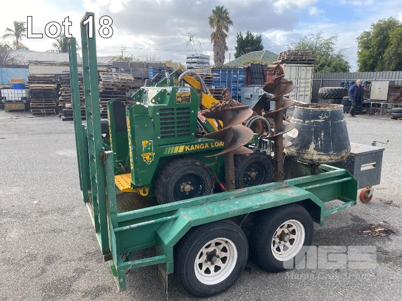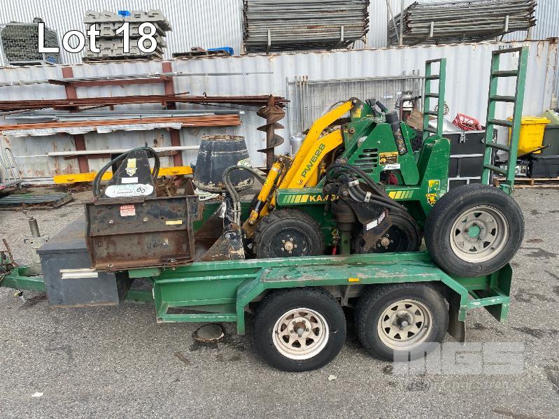KANGA PW628 MINI LOADER HOURS: 784 S/NO: 1S07074 WHEELED, POWERED BY HONDA GX690 PETROL ENGINE POWER RATING 16.5kw FITTED WITH 4 IN 1 BUCKET, WITH ADDITIONAL ATTACHMENTS, INCL AUGER DRIVE UNIT, DIGGA ORBITAL MOTOR MOD: DGSL-100 WITH 3 AUGERS & CONCRETE MIXER TRENCHING ATTACHMENT MOD: UNI900 TRENCHER KEY# 40 MOUNTED ON 2014 BROOKS 5 x 8 TANDEM AXLE PLANT TRAILER REG: S987 TEI VIN: 6T9T2700SE0D1R033 REAR LOAD RAMPS, HINGED, BALL HITCH, BRAKES, JOCKEY WHEEL FRONT MOUNT TOOL BOX