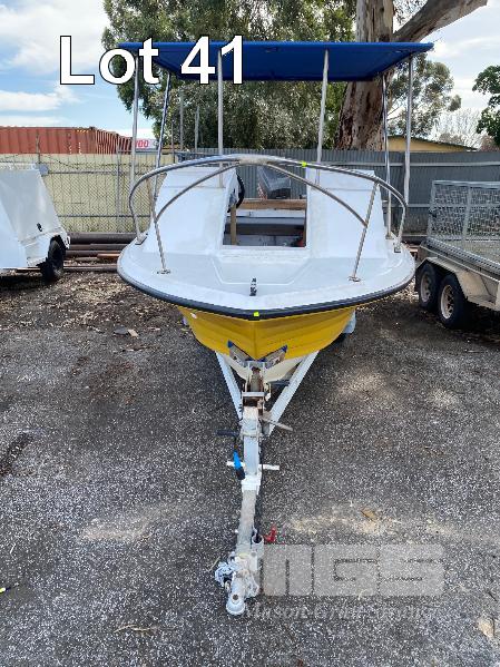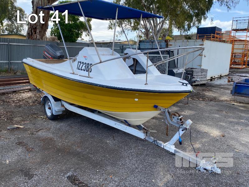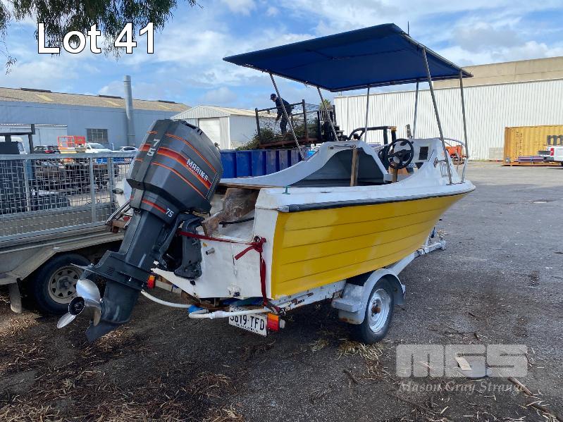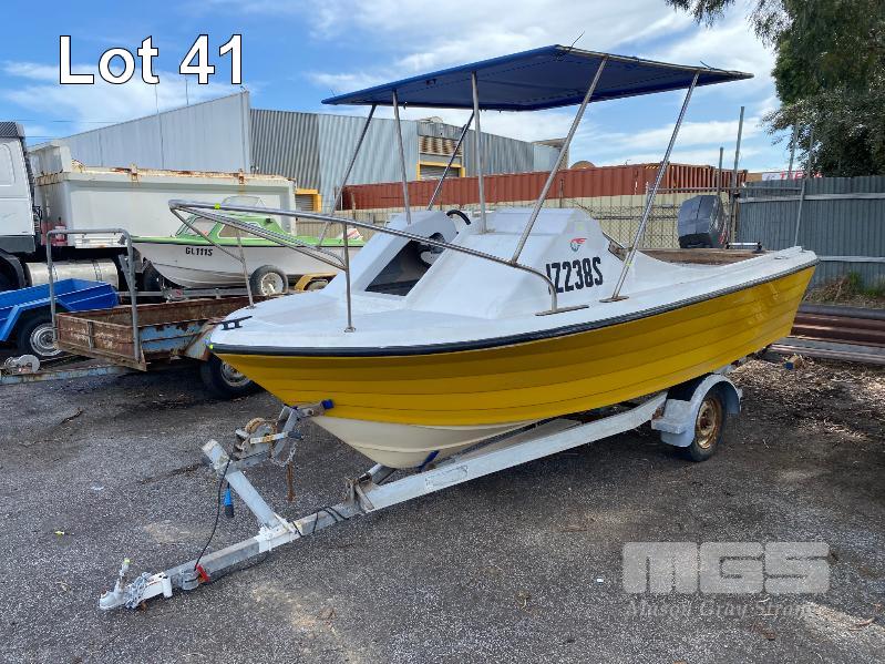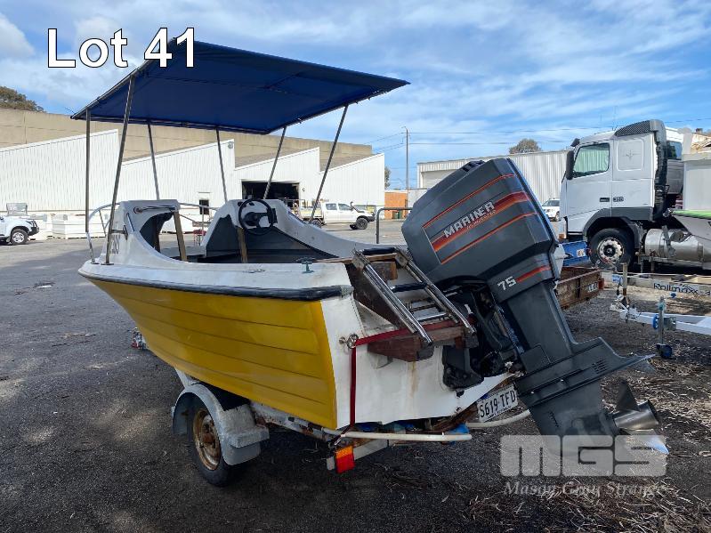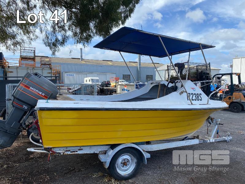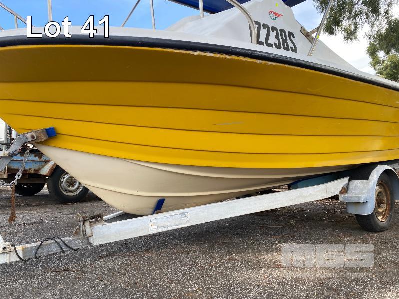 1992 CUDDY CABIN BOAT, YALTA MARINE REG: IZ238S FIBREGLASS, 4.6m POWERED BY MARINER 75HP OUTBOARD ENGINE FITTED WITH CANOPY, YELLOW/WHITE WITH REG PAPER ON SINGLE AXLE TRAILER, GALV STEEL REG: S619 TFD (SA) BALL HITCH, HAND WINCH, WITH REG PAPER