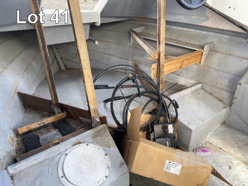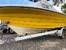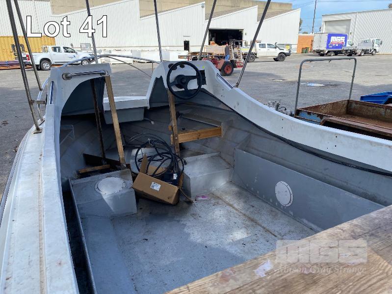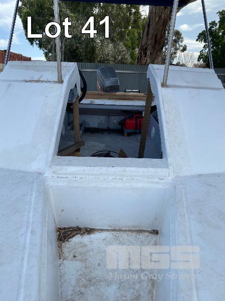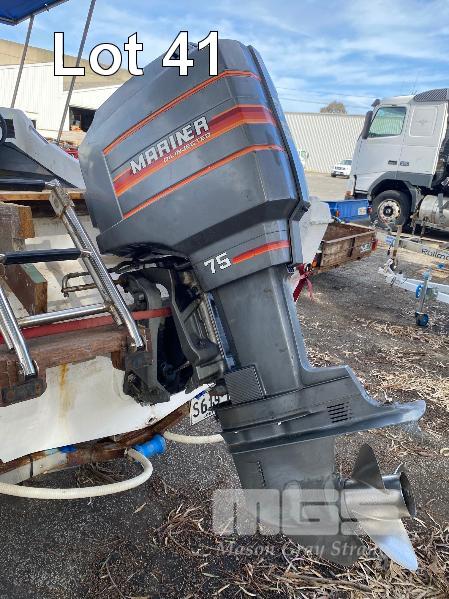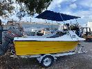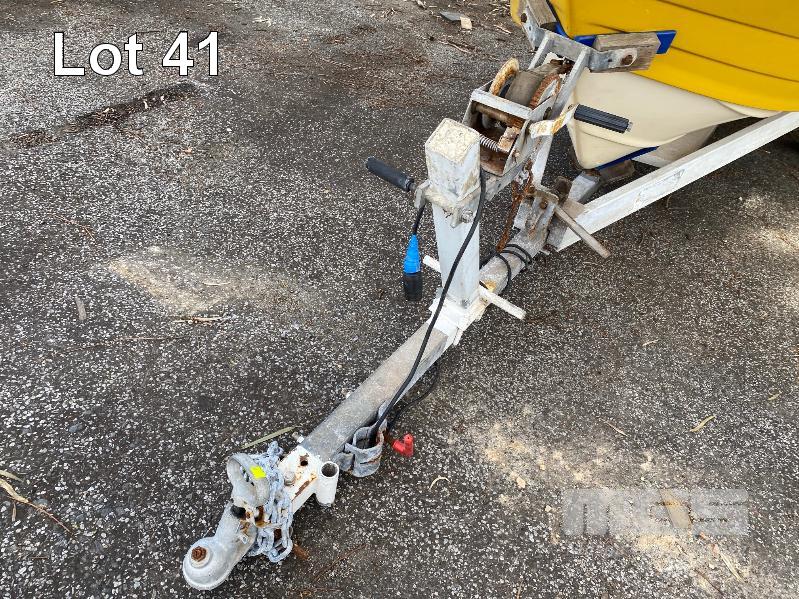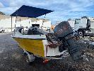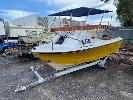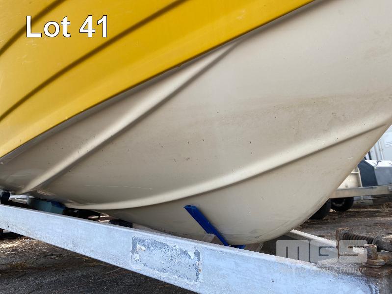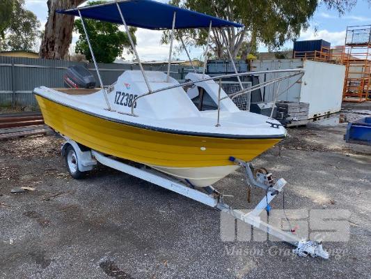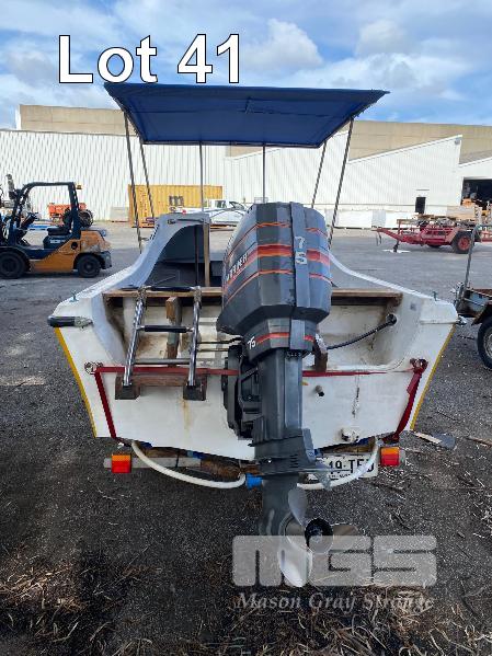 1992 CUDDY CABIN BOAT, YALTA MARINE REG: IZ238S FIBREGLASS, 4.6m POWERED BY MARINER 75HP OUTBOARD ENGINE FITTED WITH CANOPY, YELLOW/WHITE WITH REG PAPER ON SINGLE AXLE TRAILER, GALV STEEL REG: S619 TFD (SA) BALL HITCH, HAND WINCH, WITH REG PAPER