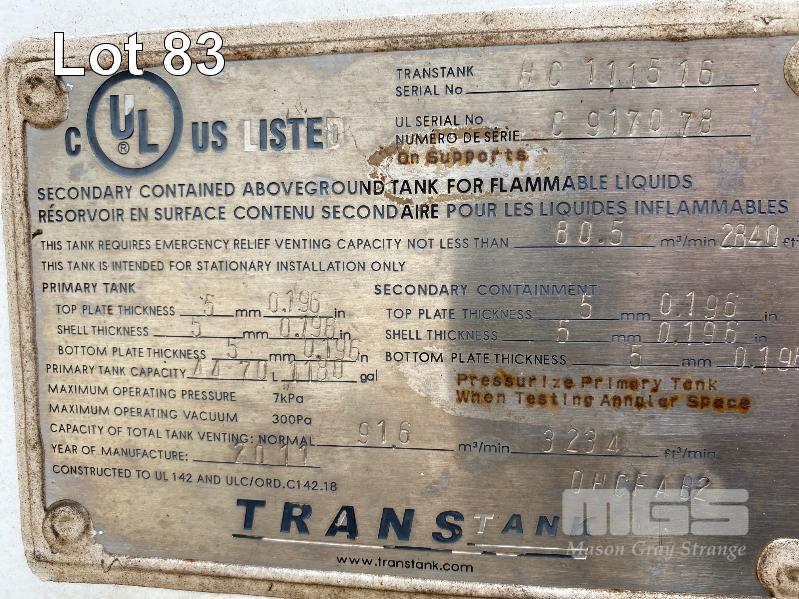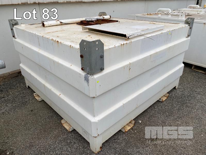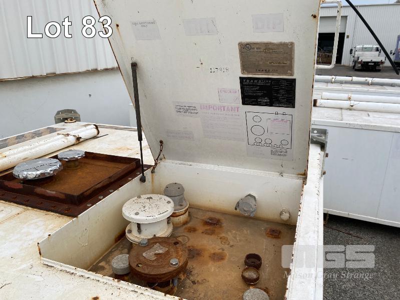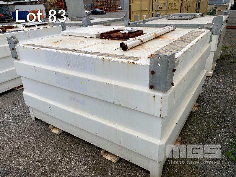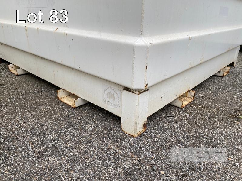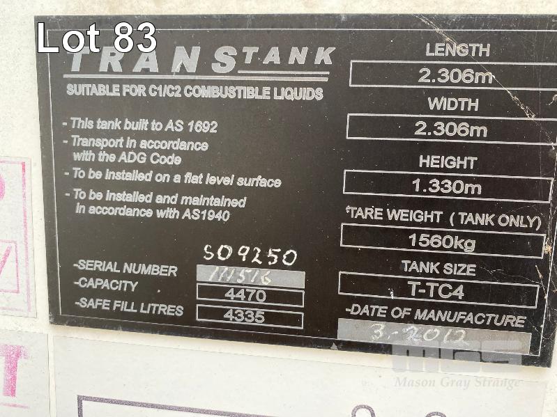 TRANSPORTABLE FUEL POD, TRANS TANK DOM: 2012 TANK SIZE T-TC4 CAPACITY: 4470 LITRES LENGTH: 2,306mm WIDTH: 2,306mm HEIGHT: 1,330mm TARE WEIGHT: 1,560kg FITTED WITH FORK POCKETS & LIFTING POINTS BREATHER RISER PIPE STACKABLE
