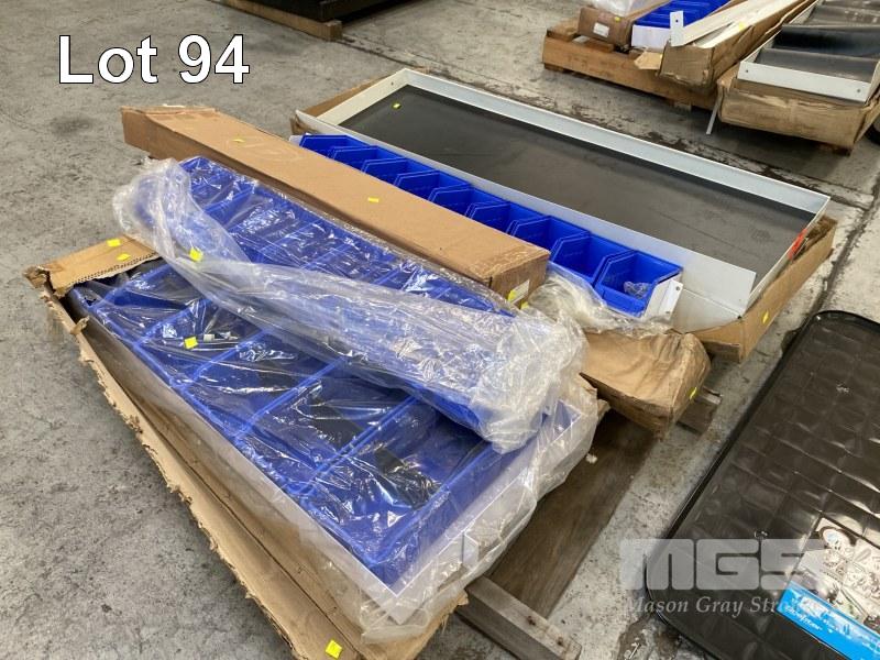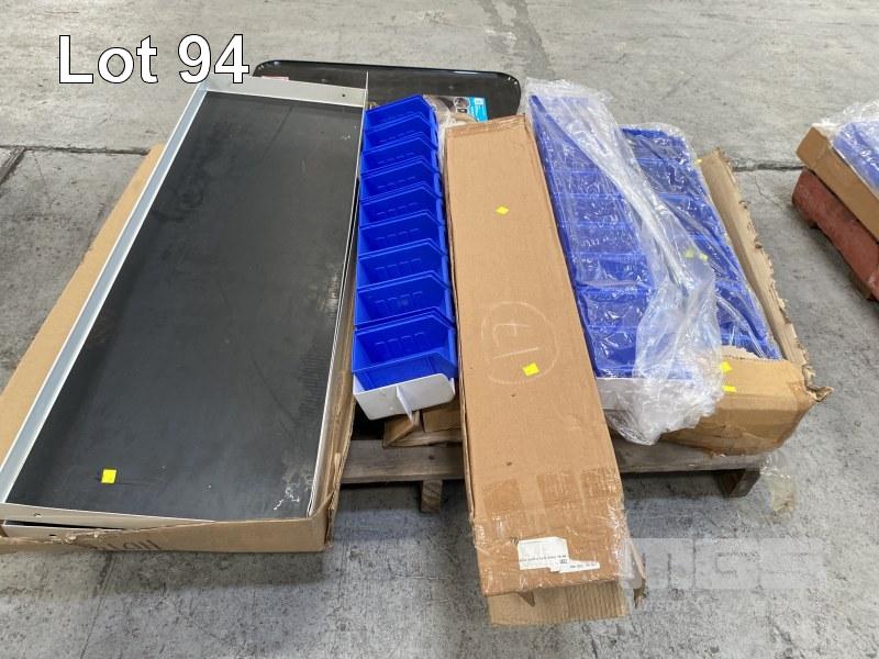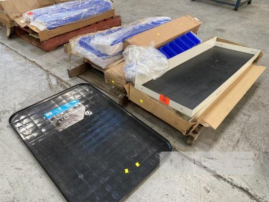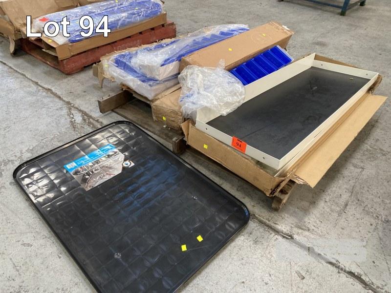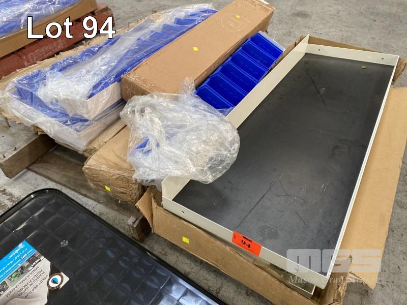 TRADIES SHELVING FIT OUT TO SUIT VAN INCLUDING 2 x STEEL SHELF TRAYS, 1250 x 430mm 1 x STEEL SHELF TRAY, 950 x 430mm, 2 x PARTS DRAWER SHELVES, 1000 x 150mm, WITH PARTS DRAWERS & 2 x OIL DRIP TRAYS, 1 x PALLET