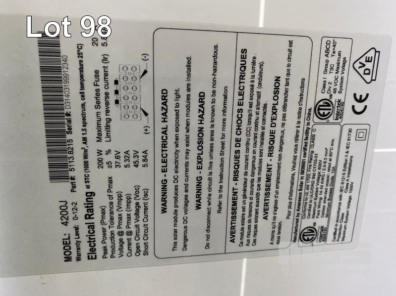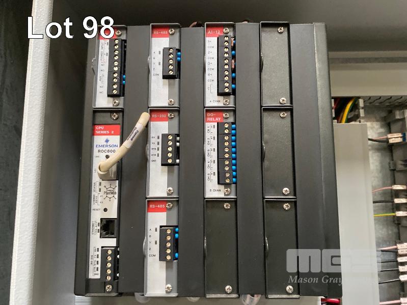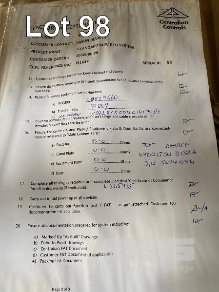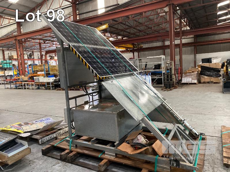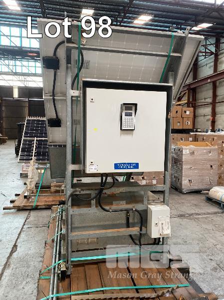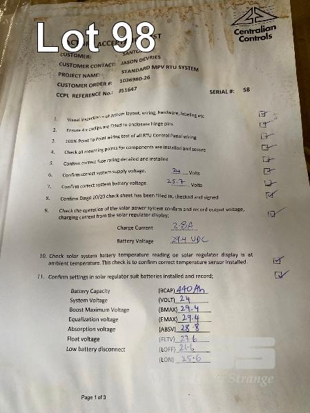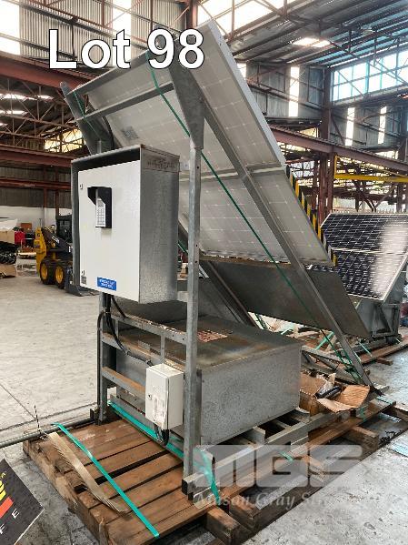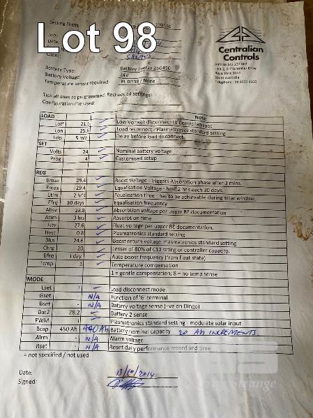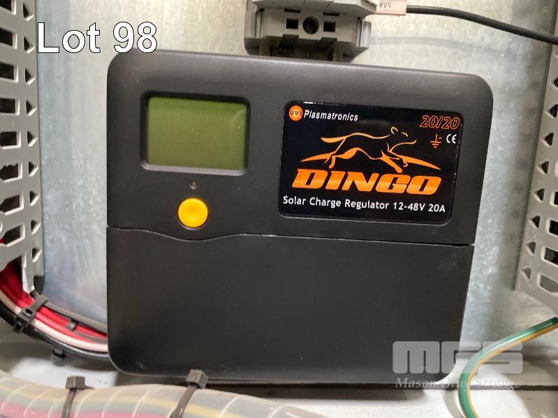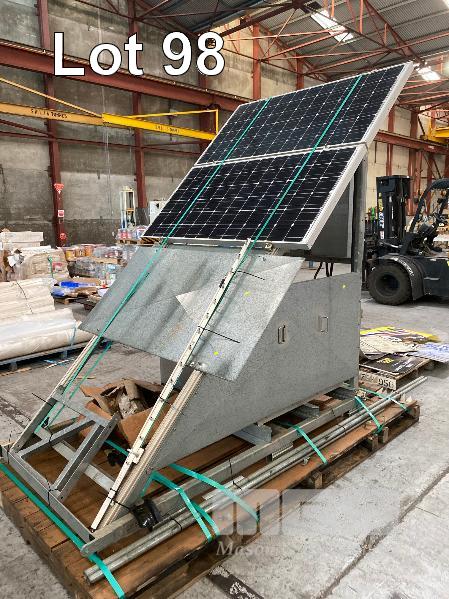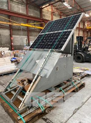SOLAR POWER BATTERY SYSTEM, CENTRALIAN CONTROLS 24V, WEATHER PROOF & RUGGED CONSTRUCTION, TWIN SOLAR PANELS MODEL: 4200J, 200W, 37.6V,5.32A each, MOUNTED TO STEEL FRAMEWORK, WITH 440AH BATTERY CAPACITY IN STEEL ENCLOSURE, CONTROLLED BY EMERSON PLC INTERFACE, PLANT WEB ROC800 CPU WITH DINGO SOLAR CHARGE REGULATOR & TRIO DATACOM DR900.