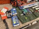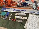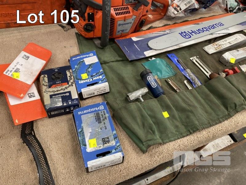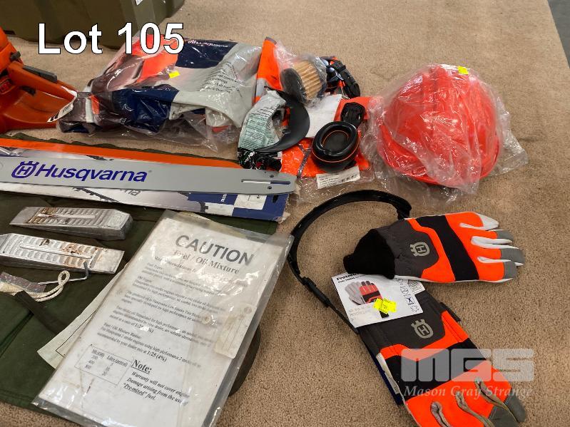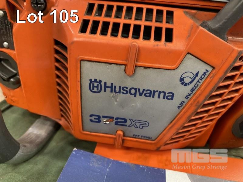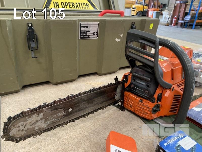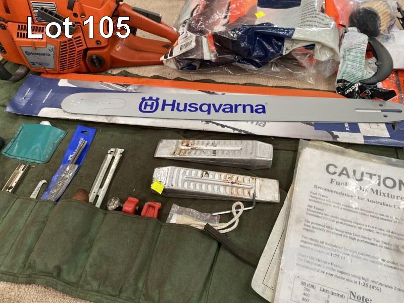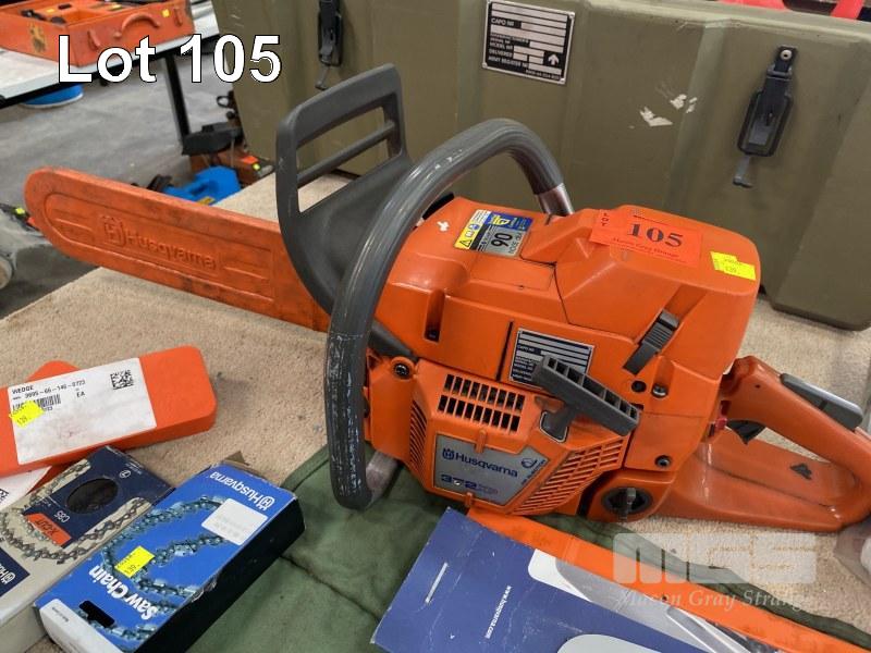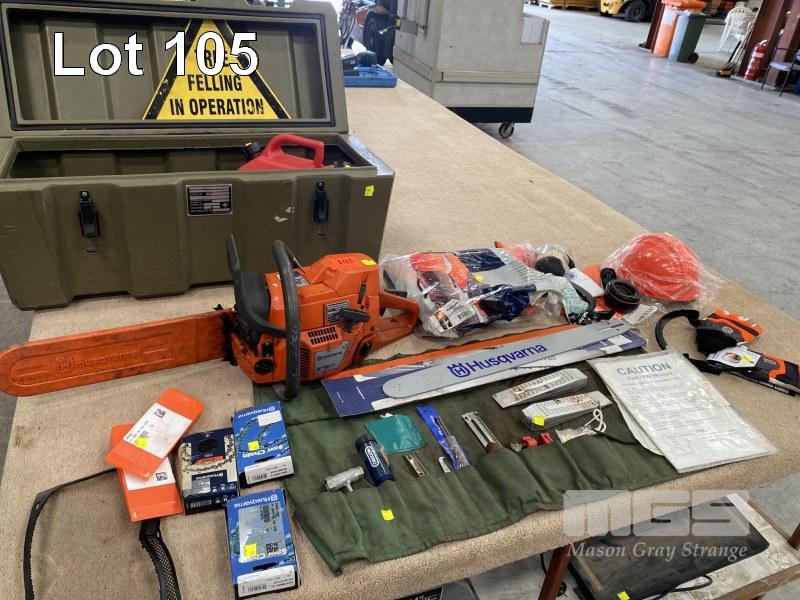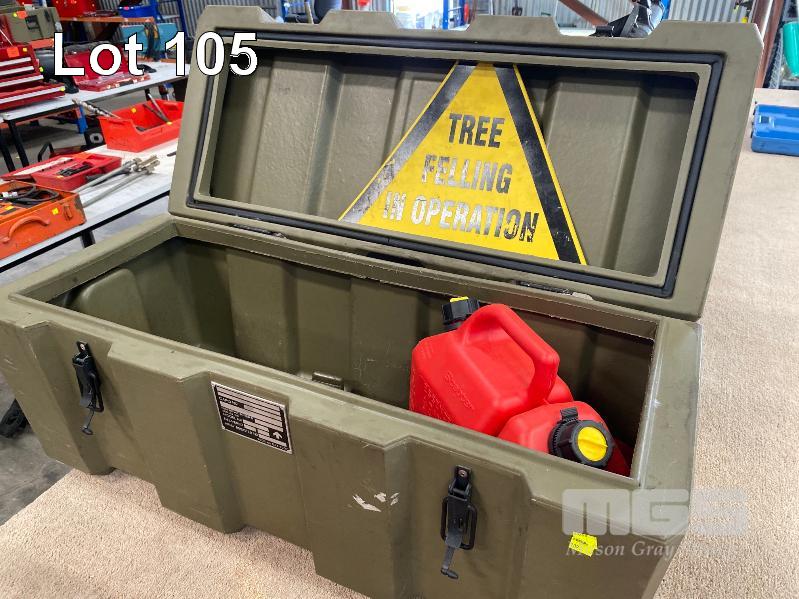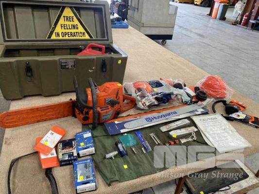 CHAINSAW, HUSQVARNA MOD: 372XP PETROL, 2 STROKE FITTED WITH 400mm BAR WITH HUGE ASSORTMENT OF ACCESSORIES INCLUDING NEW 600mm BAR & 3 x SPARE CHAINS, SHARPENING & TOOL KITS TO SUIT, SAFETY GEAR, WEDGES, POLY FUEL CAN & MIL SPEC STORAGE CASE, GREEN POLY, 900 x 400 x 400mm