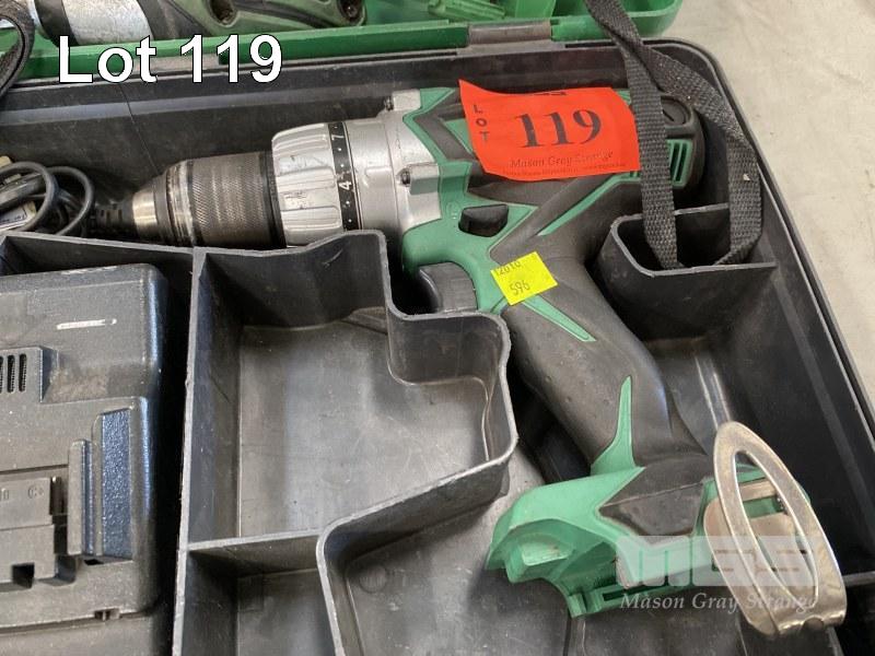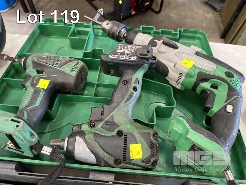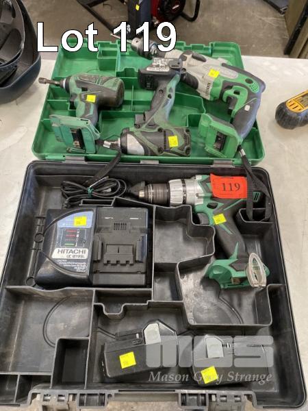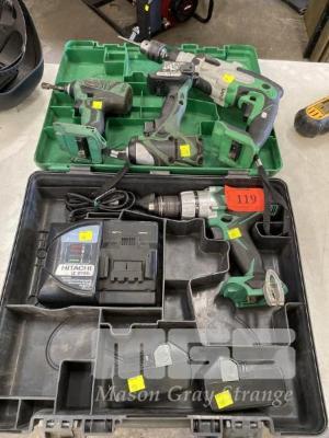 HITACHI CORDLESS POWER TOOLS, INCLUDING IMPACT DRILL, HAMMER DRILL, IMPACT DRIVER & TECK GUN WITH 2 x BATTERIES & CHARGER IN CARRY CASE