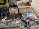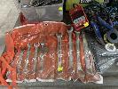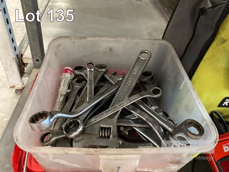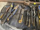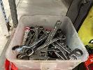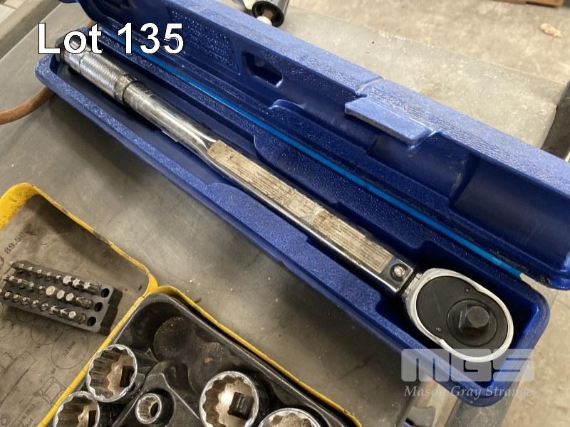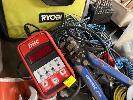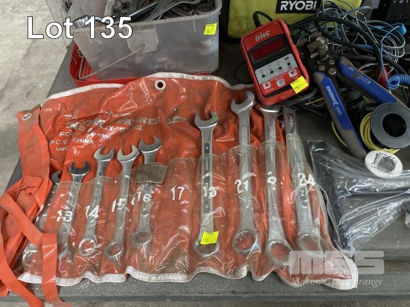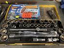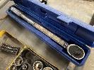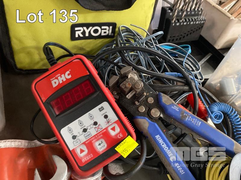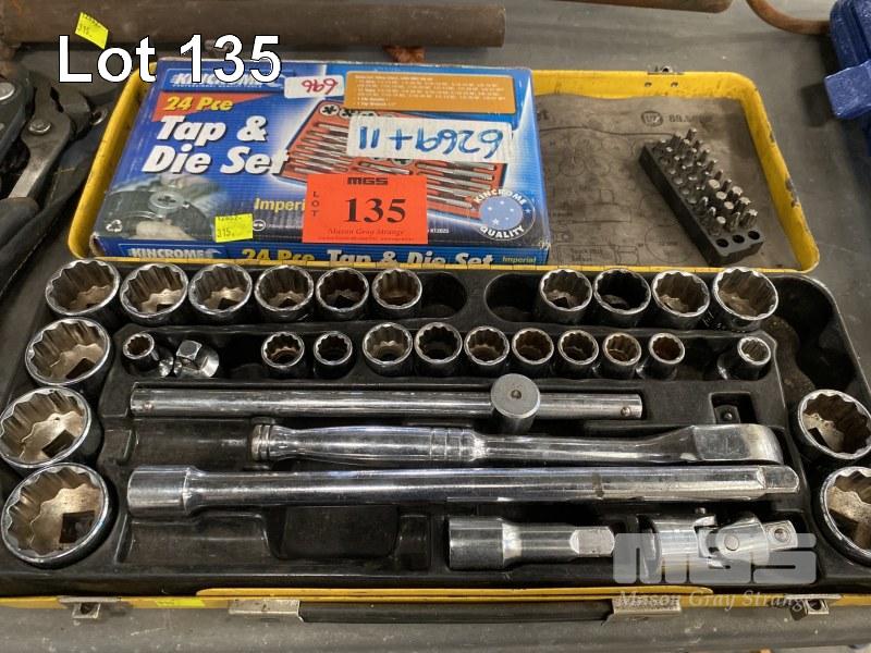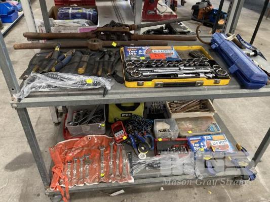 SOCKET SETS, STANLEY 1/2" DRIVE, KINGCROME TORQUE RATCHET 10-150 F/1B SPANNERS, BATTERY ANALYSER, DRILL BITS, 2 x TAP & DIE SETS, CLAMPS, ETC 2 x SHELVES