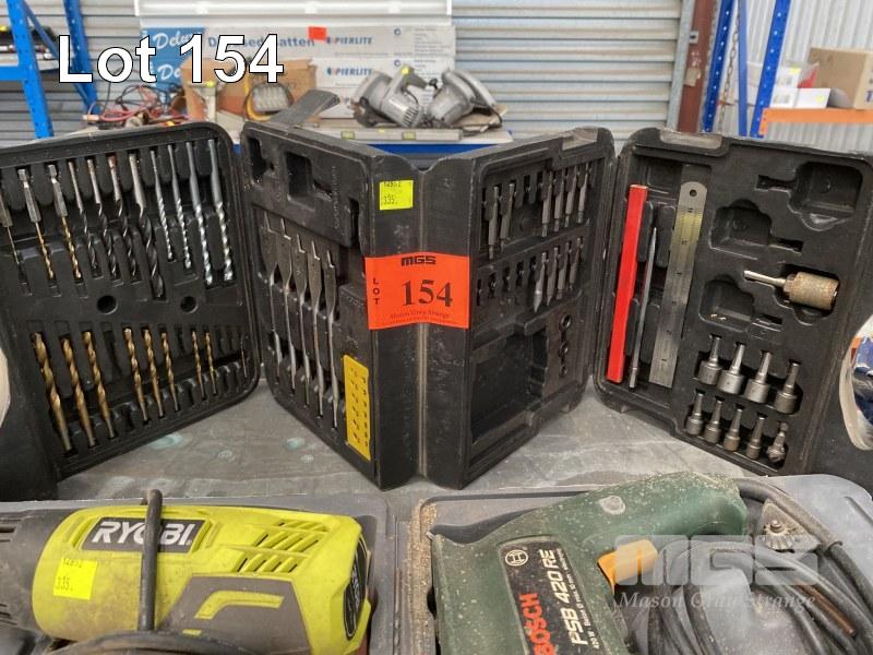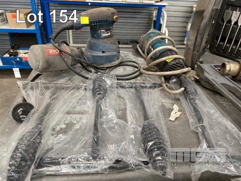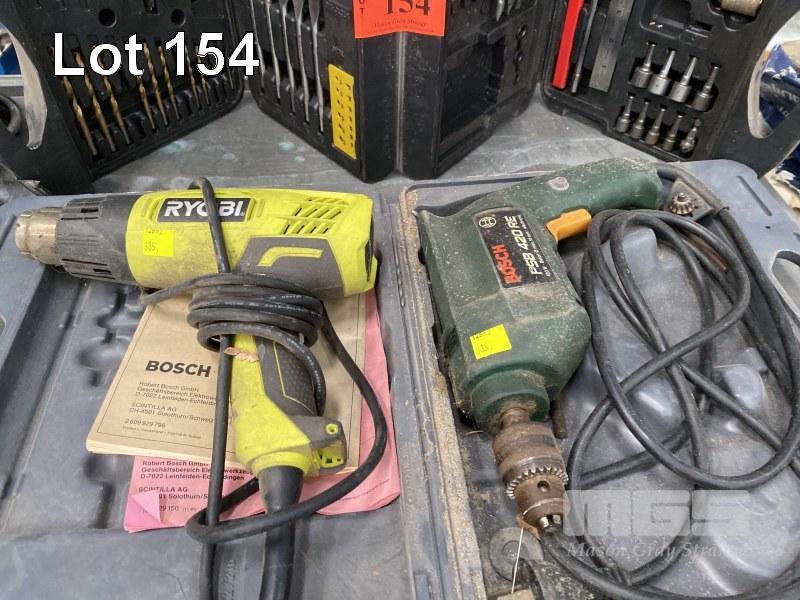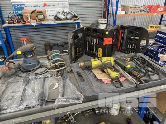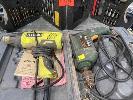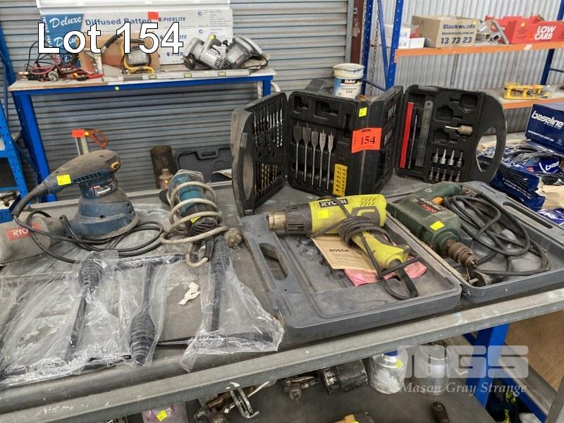 BOSCH DRILL, RYOBI HEAT GUN, MAKITA ANGLE GRINDER, RYOBI ORBITAL SANDER, DRILL BIT, DRIVER SET & 4 x WELDING HAMMERS 1 x SHELF
