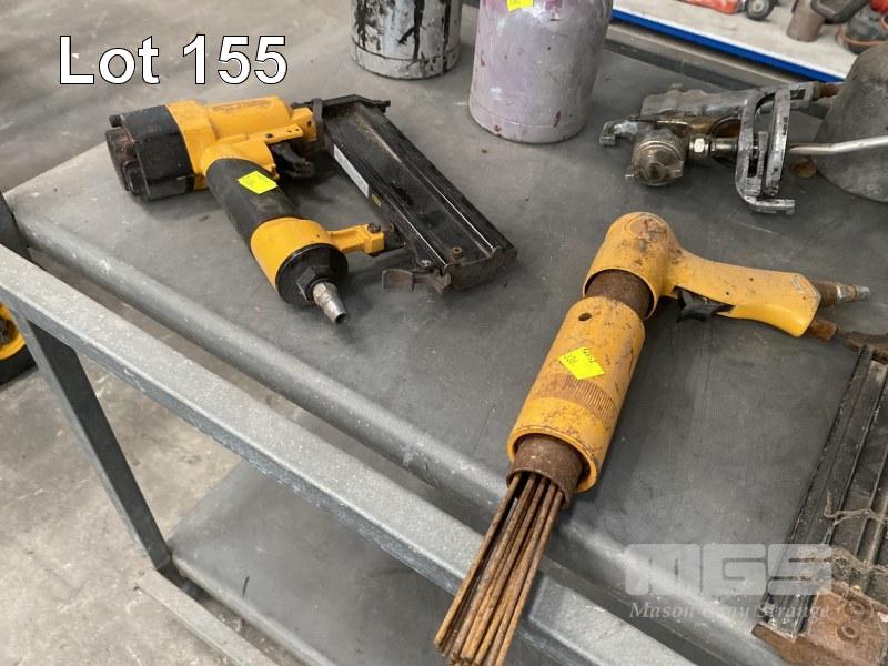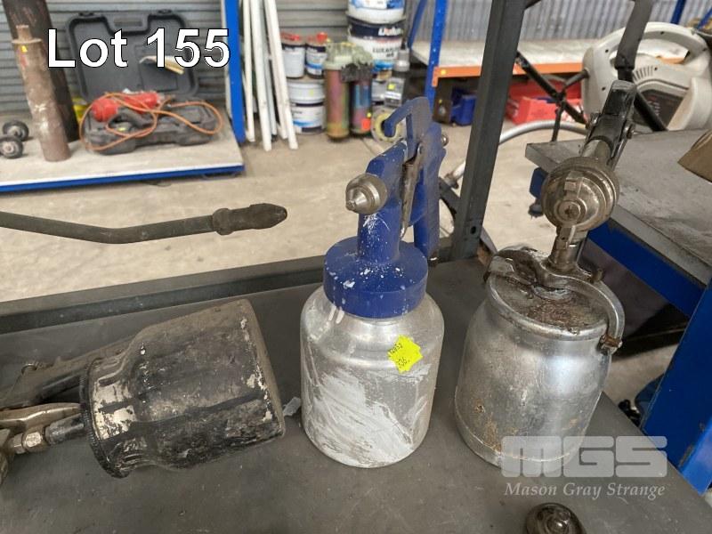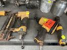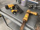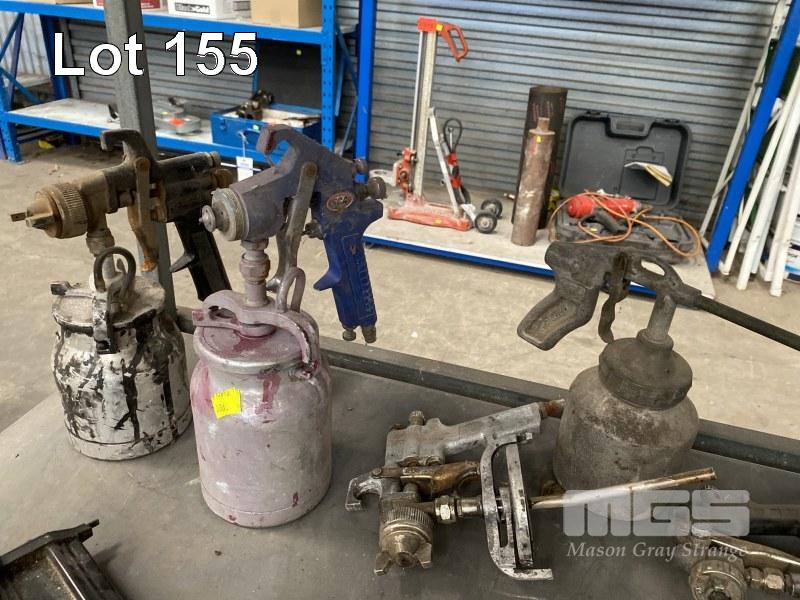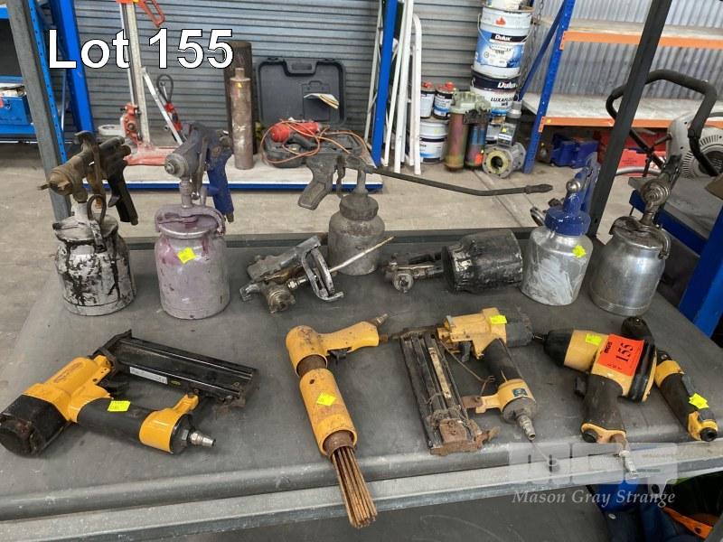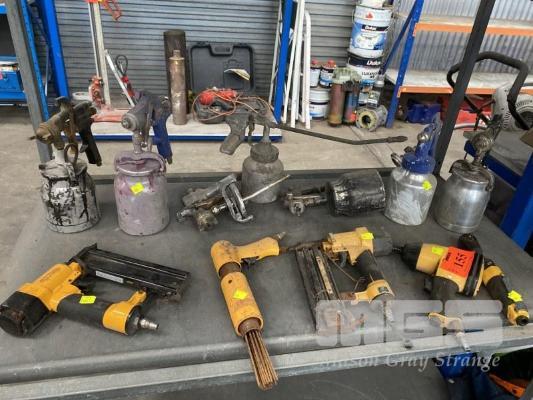 PNEUMATIC TOOLS iNCLUDING STAPLE & BRAD GUN, RATCHET, IMPACT DRIVER, NEEDLE GUN & 4 x SPRAY PAINT GUNS WITH KERO GUN 1 x SHELF